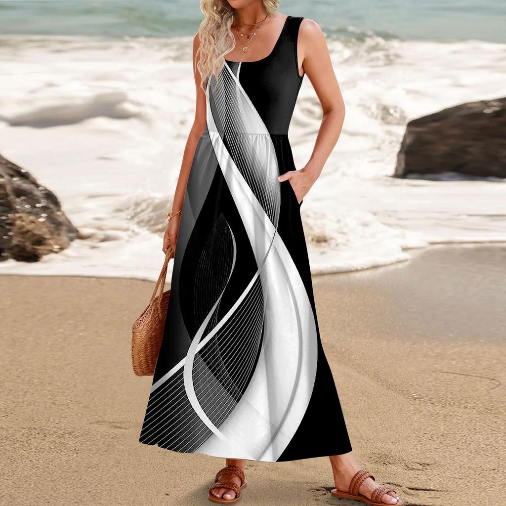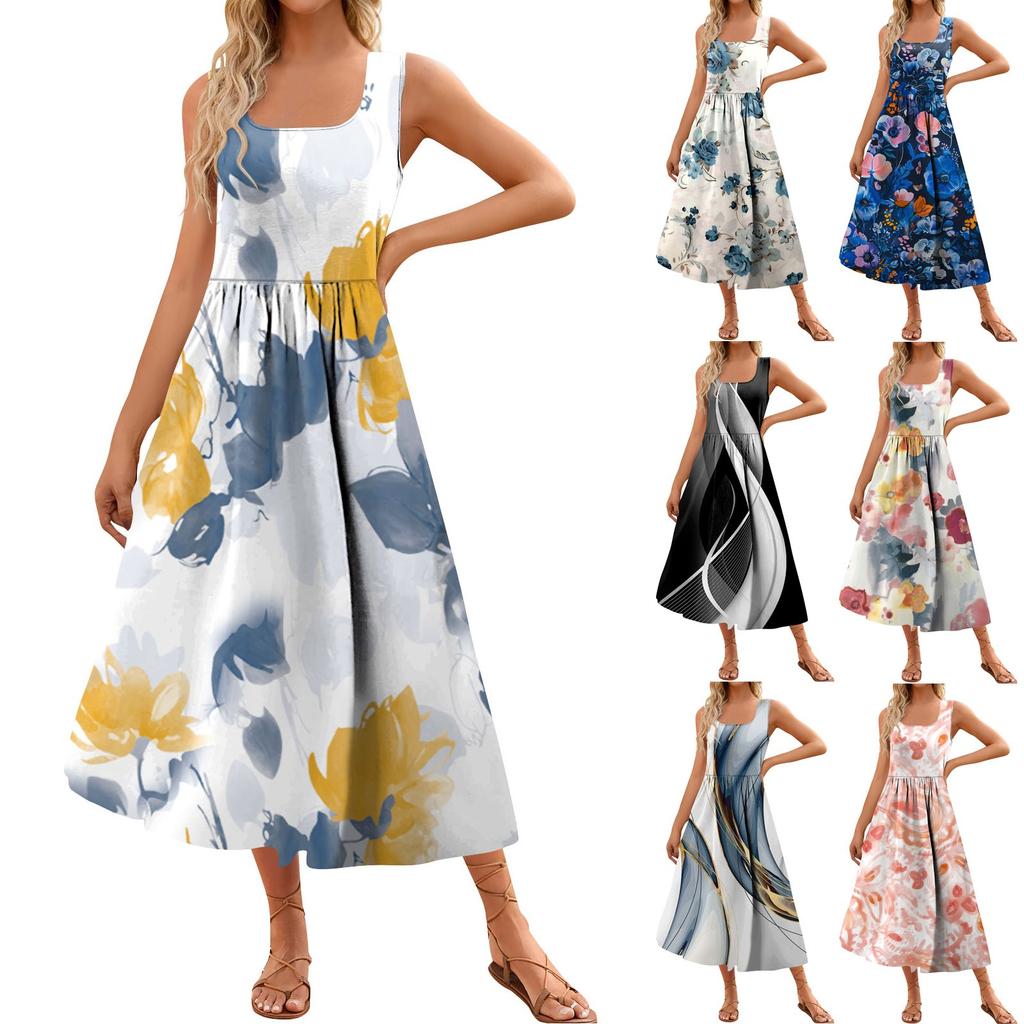 Женское летнее платье макси 2024, повседневное платье без рукавов с цветочным принтом и квадратным вырезом, струящиеся длинные пляжные элегантные сарафаны на бретелях с карманами