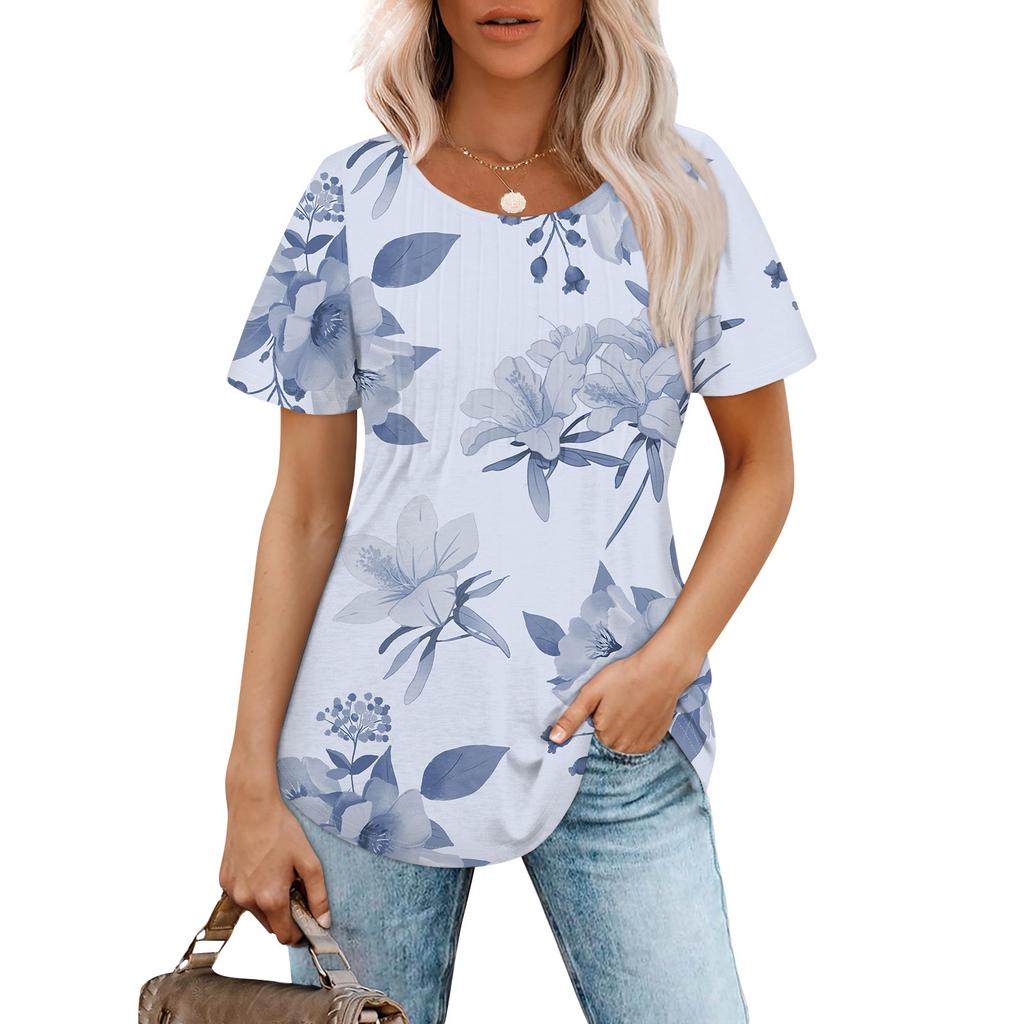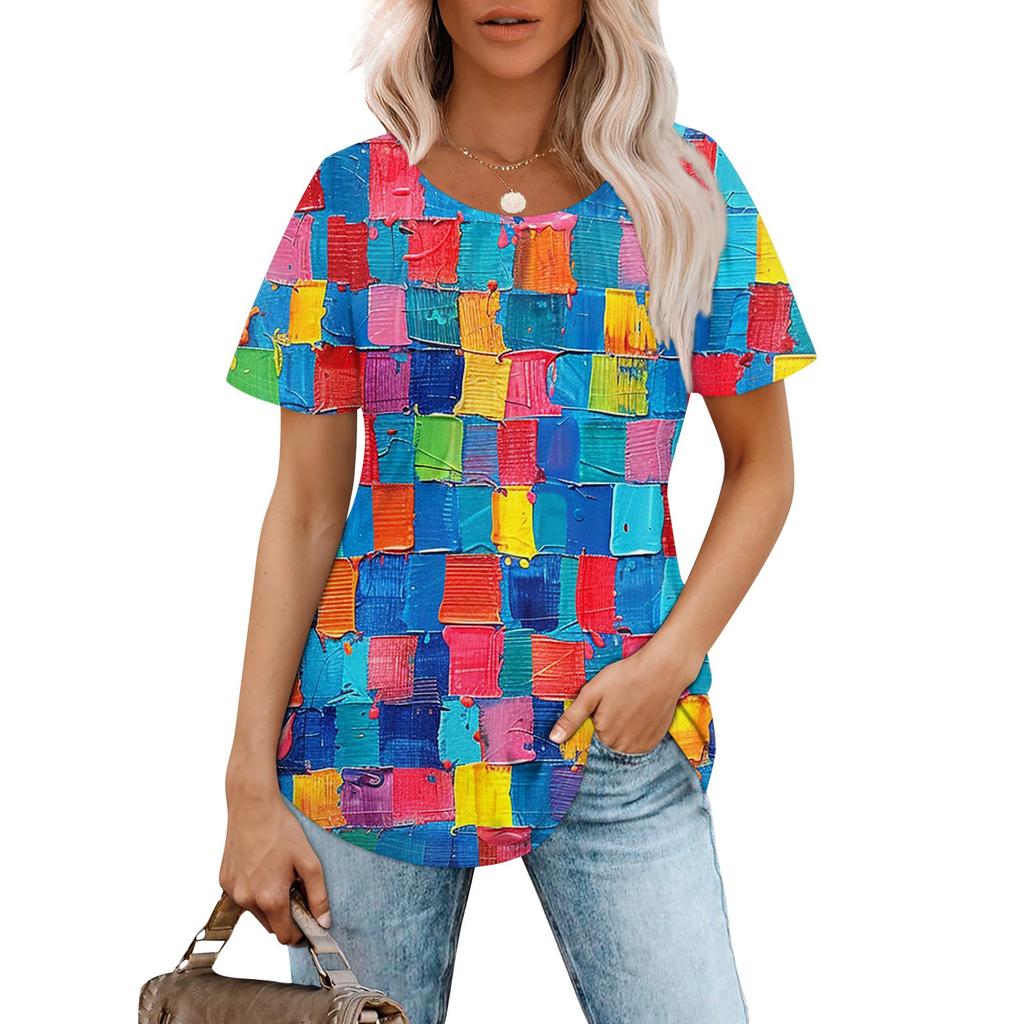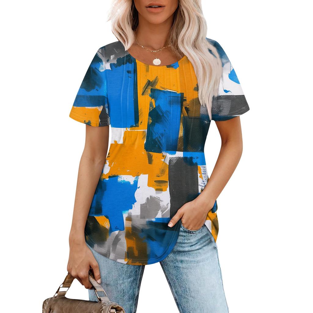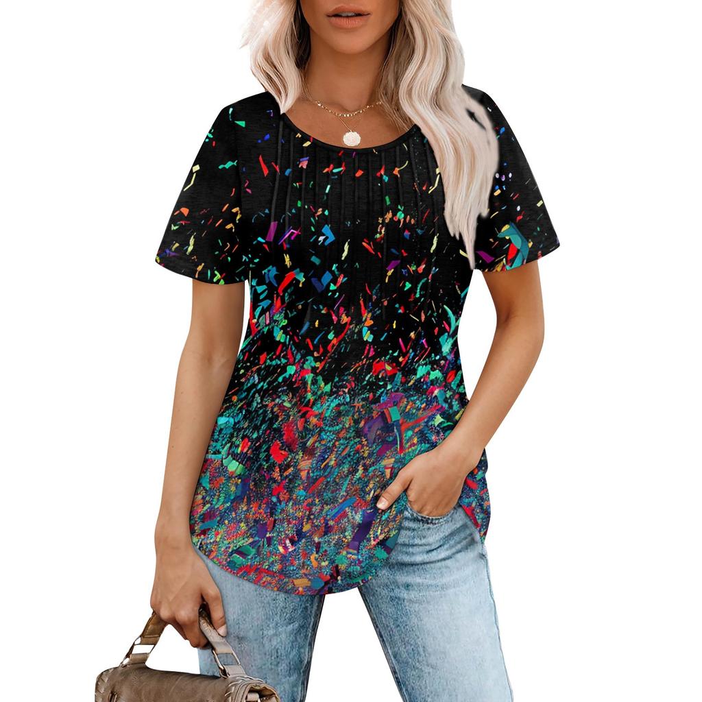 Женская модная повседневная плиссированная футболка с короткими рукавами и круглым вырезом с градиентным принтом