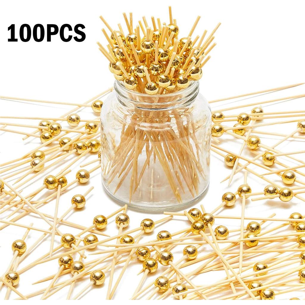 Золотые жемчужные палочки для коктейлей, гальваническая вилка для фруктов из бисера(4,7 дюйма, 100 шт. в упаковке)