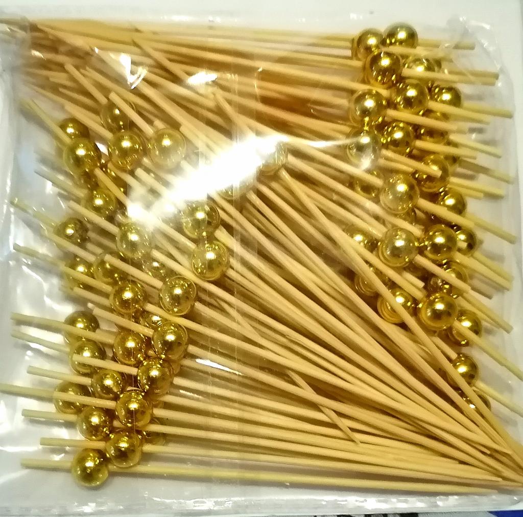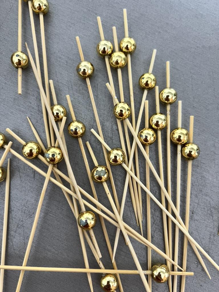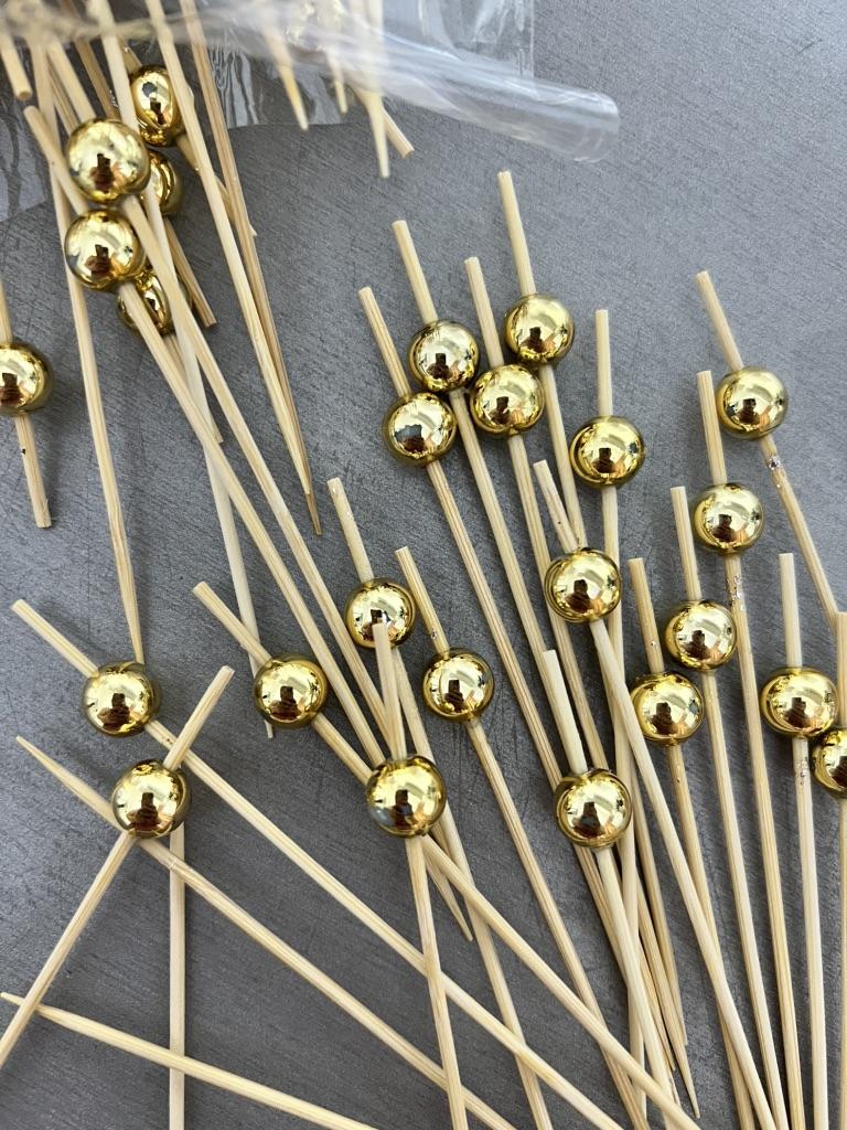 Шпажки с золотыми жемчужинами, размер шпажки 12 см. Цена 213 рублей. Очень понравились, спасибо 🌹. Красивое украшение для канапе.