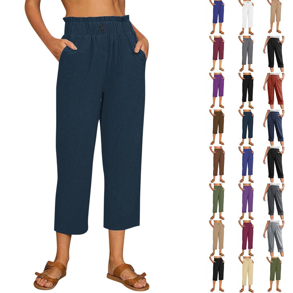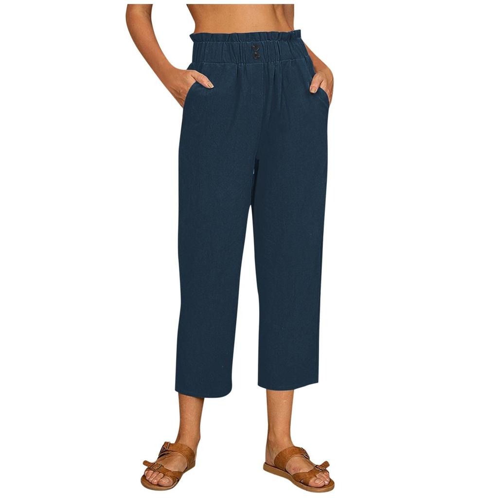 Женские свободные повседневные брюки из хлопка и льна, однотонные укороченные брюки с карманами и эластичной резинкой на талии