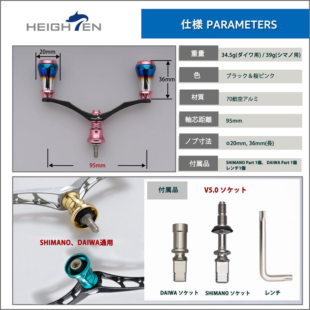 [Размер] Диаметр ручки 20 мм, расстояние между осями ручки 95 мм [Вес] V1.0 - 45 г/Улучшенная версия V2.0 - 38,5 г [Материал] Авиационный алюминий серии 70 [В комплект входит ручка катушки] 1 ДЕТАЛЬ DAIWA, 1 ДЕТАЛЬ SHIMANO, 1 гаечный ключ, 1 многофункциональный ключ (ограниченный подарок).