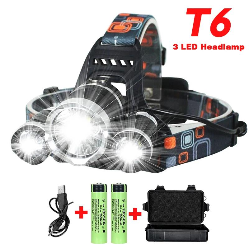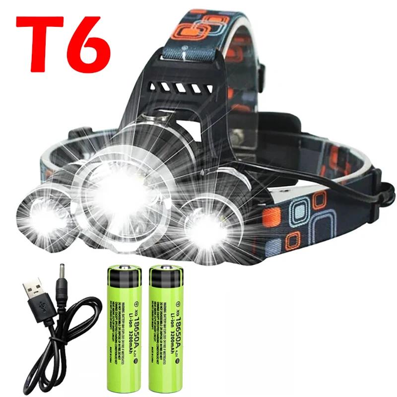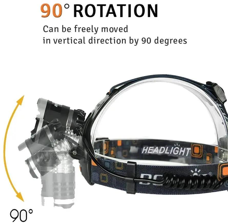 T6 Мощный налобный фонарь Перезаряжаемый светодиодный налобный фонарь Регулируемый на 90° фонарик Для рыбалки, охоты, кемпинга, Портативный фонарик-лампа