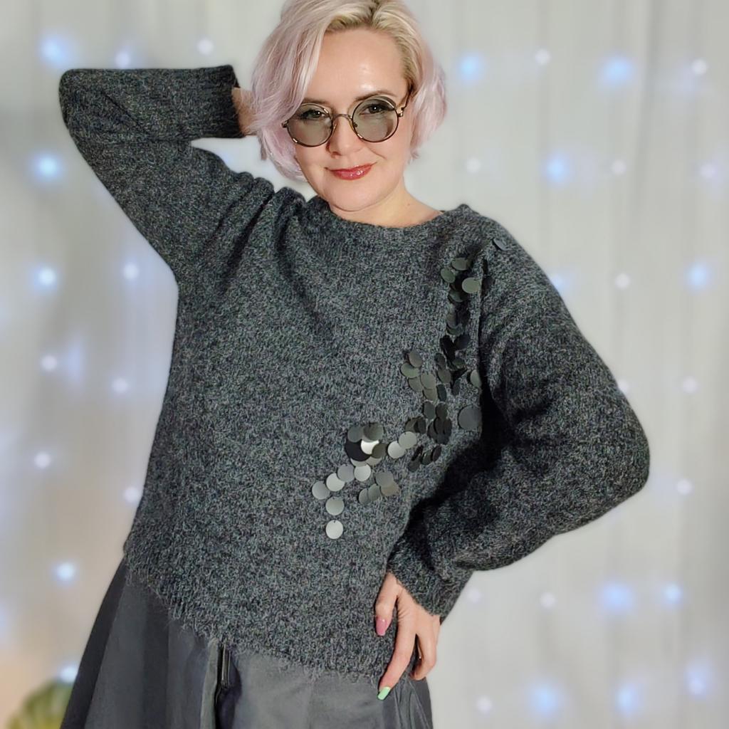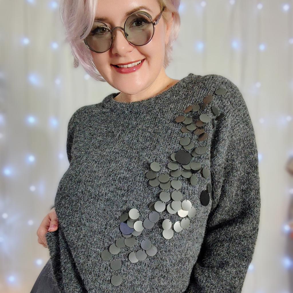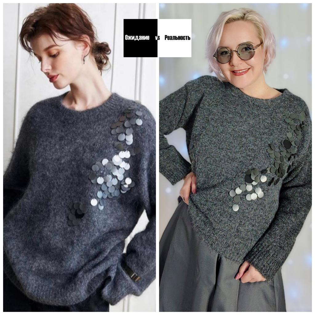 Классный джемпер с матовыми пайтками. Привет! Это прихорошенький джемпер влюбил в себя сразу. Такой классный девчат - ну, просто любовь! ‼️Добавила разговорное видео посмотрите перед покупкой там больше деталей ‼️ Ткань: Ниточка скорей всего акрил, она немного пушистая, но воздушная и лёгкая. Вообще джемпер практически не ощущается на тебе при этом в нем комфортно. Полотно тянется. Дизайн : Классика - спушенные плечи, достаточно свободный крой. Пайетки пришиты одним краем таким образом есть "движение светом" и они красиво играют при разнос ракурсе освещения. Размер: На мне единый размер. Мои параметры : рост 172 см 98/74/104 см Детали : Длина 61 см Плечи 59 см Длина рукава 58 см ОГ 132 до 148 см ОТ 128 см Резюмирую: Ой, он и в пир и в мир. Однозначно станет любой вещью, носить будете часто. Рекомендую 👍 Я не прощаюсь, M_K #серые_пайетки