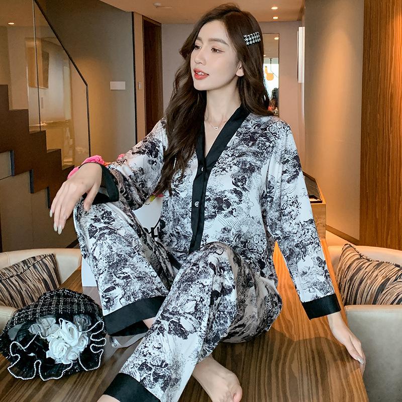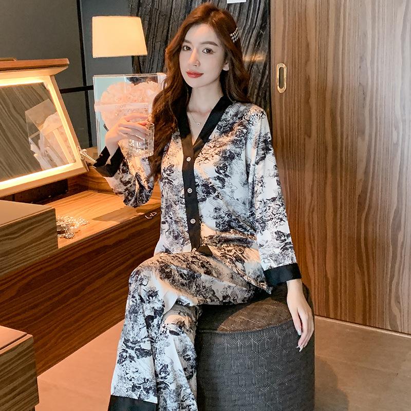 Женская модная одежда больших размеров для весны и осени с принтом, домашняя одежда из 2 предметов, V-образный вырез, длинные рукава, длинные брюки, пижамный комплект, летняя домашняя одежда из тонкого ледяного шелка