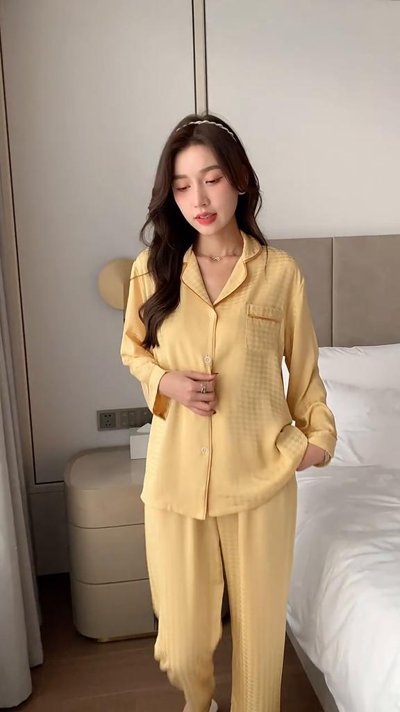 Женская домашняя одежда из шелка Ice Silk на весну и осень, женская летняя тонкая дышащая пижама из 2 предметов с длинным рукавом, жаккардовый узор «гусиная лапка» для дома