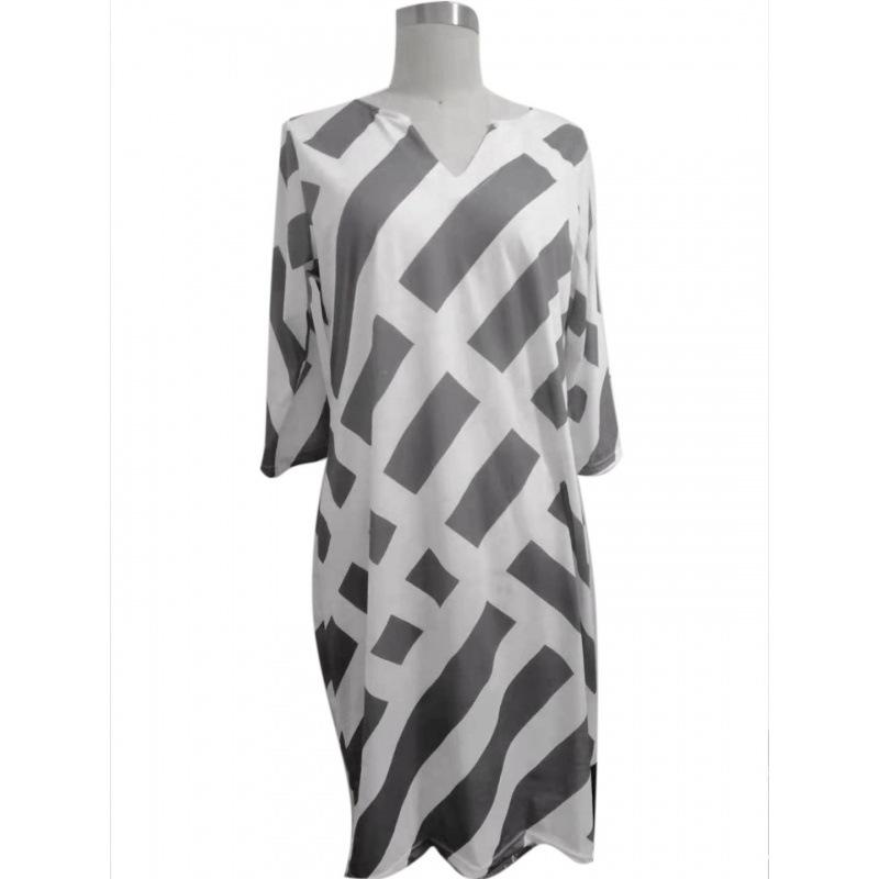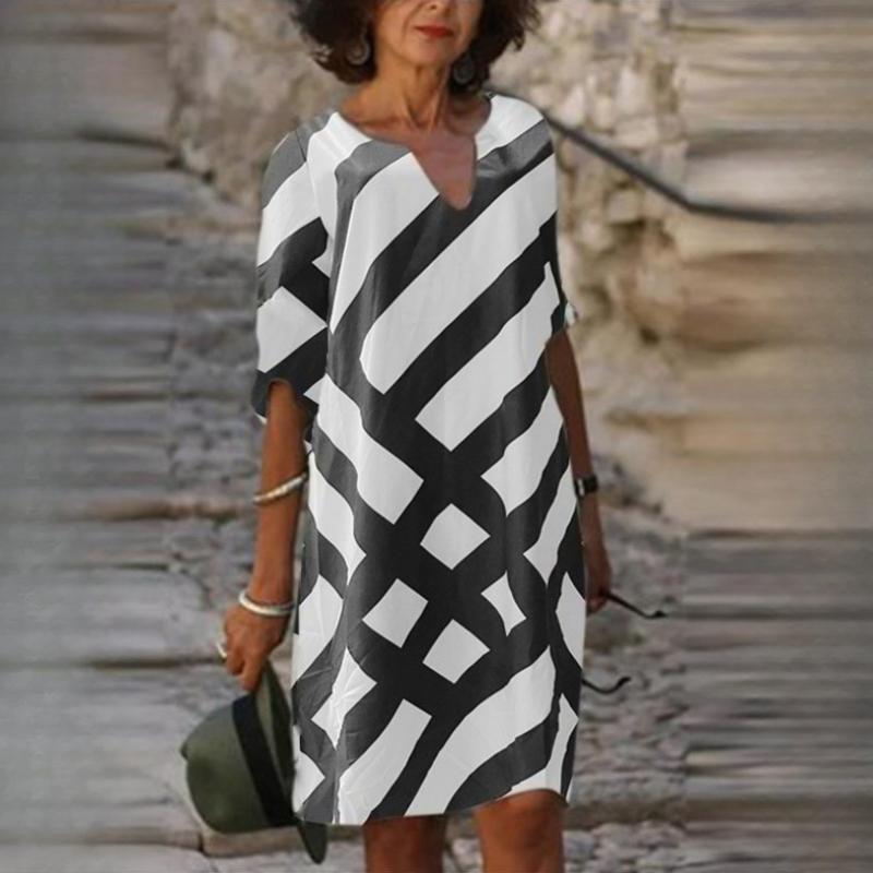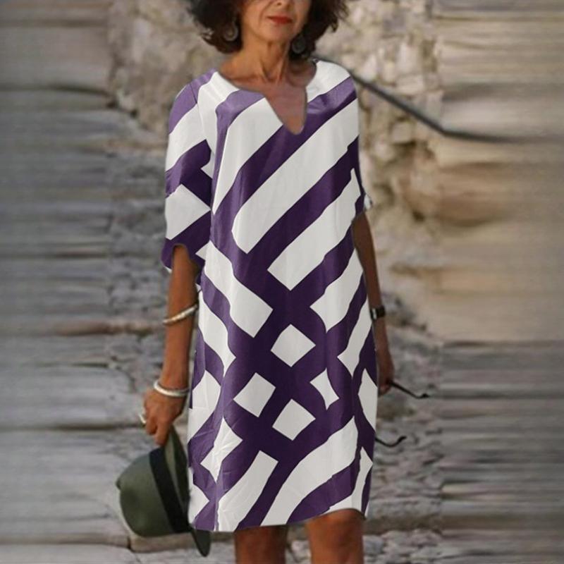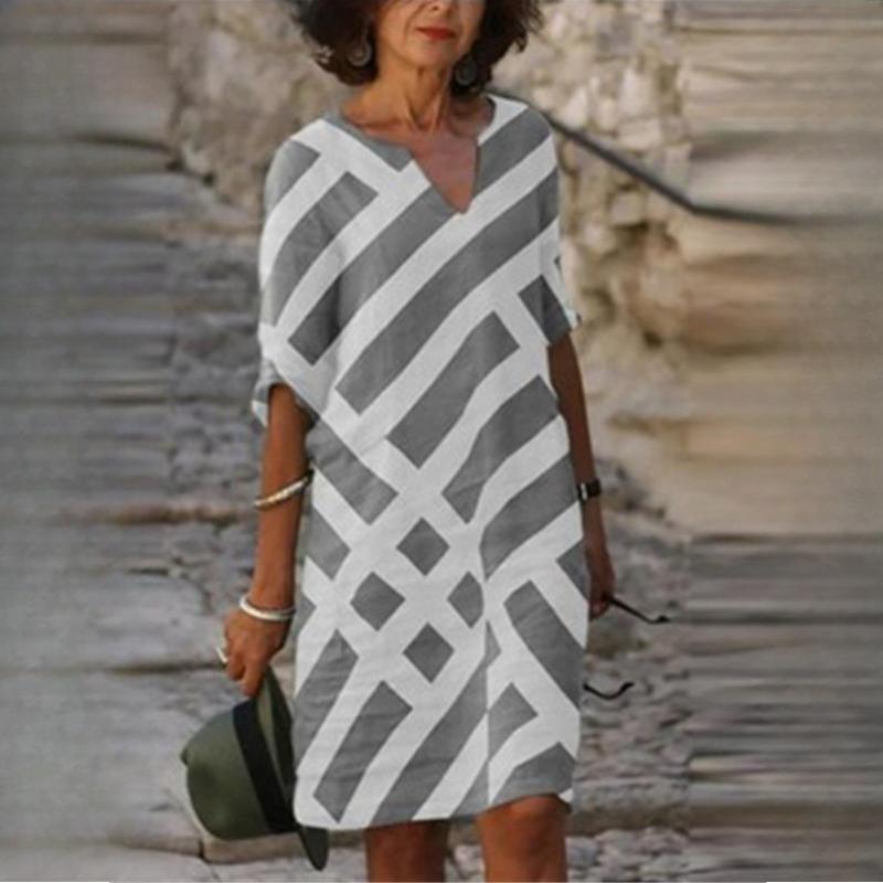 QICED Модное платье-трапеция из бамбуковой пеньки с V-образным вырезом и полосатым принтом и рукавами средней длины