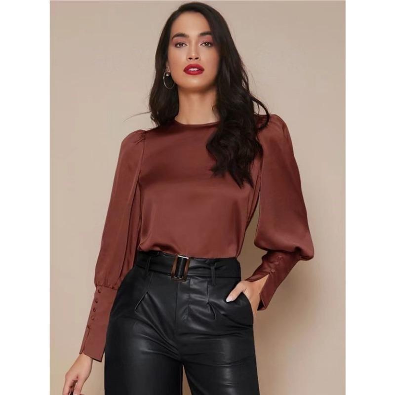 Рубашка из полиэстера с длинными рукавами, женская, весна-осень, рукава-фонарики, атласная рубашка, топ