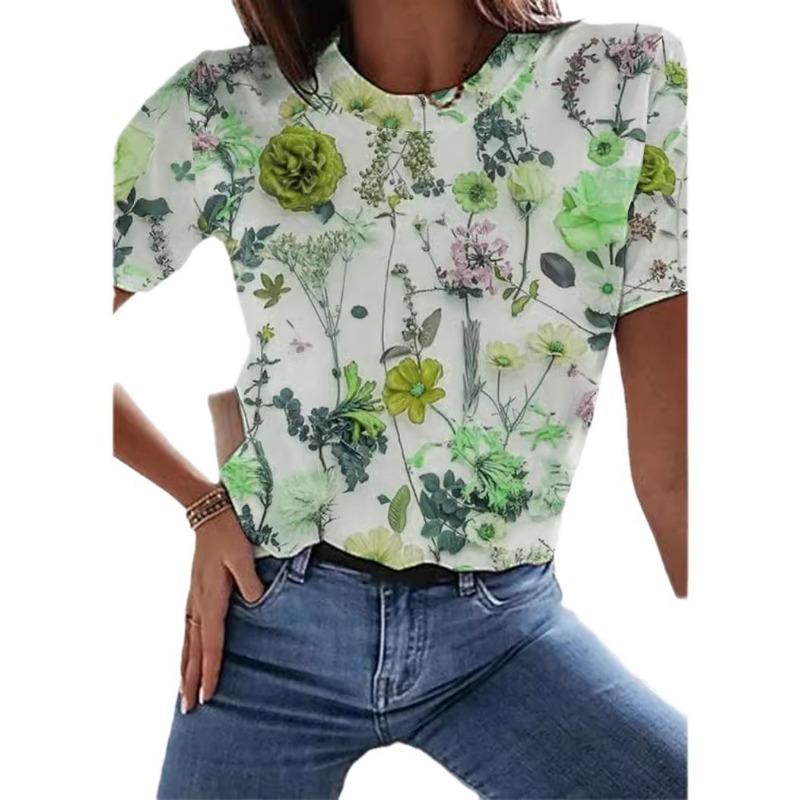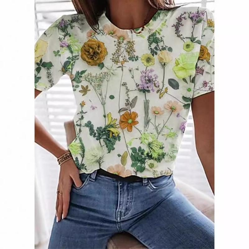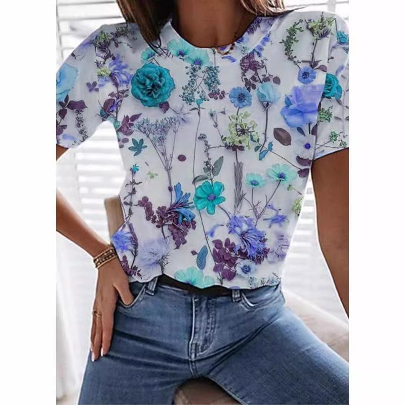 Модные удобные женские летние повседневные футболки с короткими рукавами и круглым вырезом с цветочным принтом