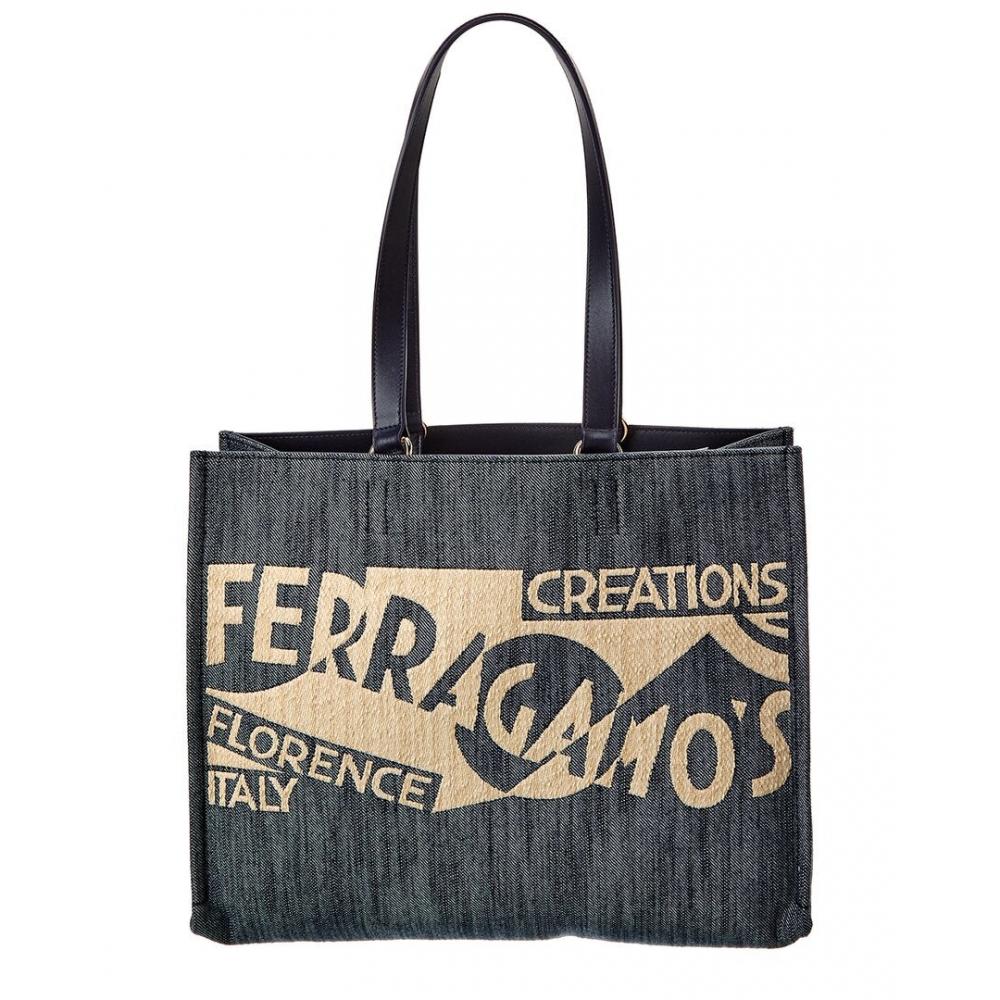 Salvatore Ferragamo Ferragamo Logo Сумка-тоут среднего размера из денима из кожи синего цвета — купить товар онлайн с бесплатной доставкой по всему миру!