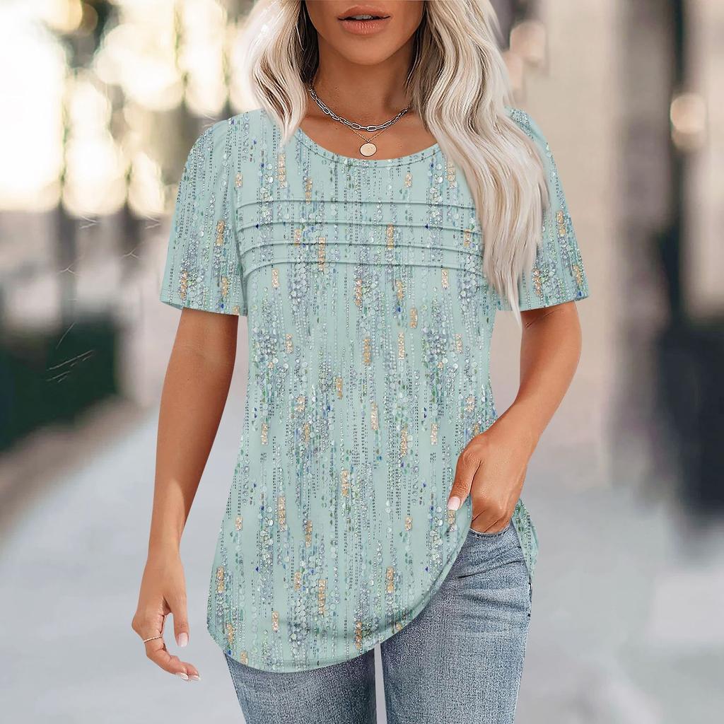 Футболки для женщин, плиссированные, с круглым вырезом, нарядные, повседневные, блузки с принтом, с коротким рукавом, летние топы, свободный крой