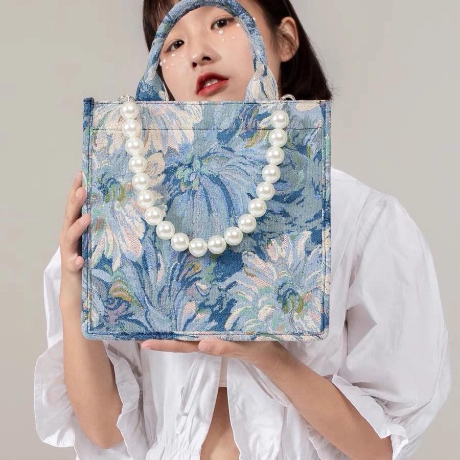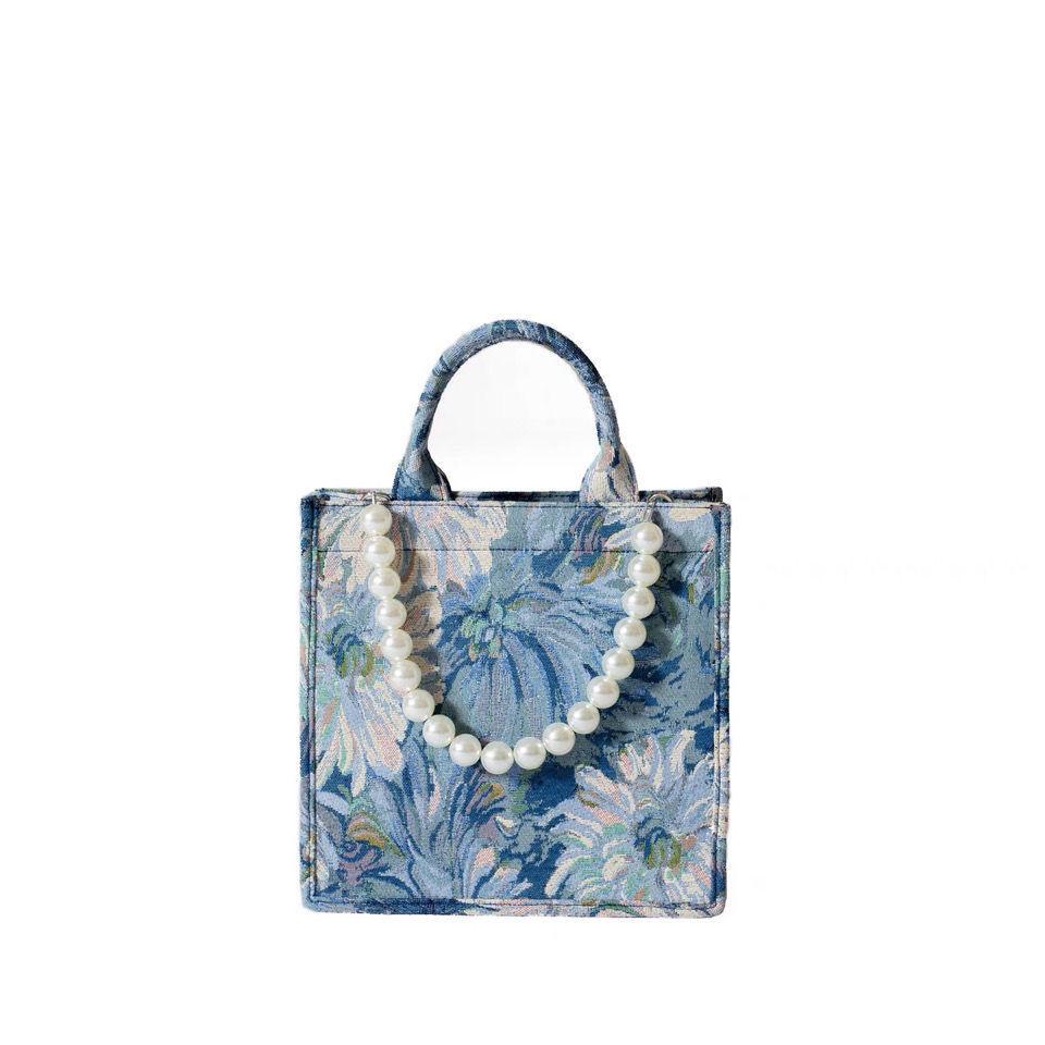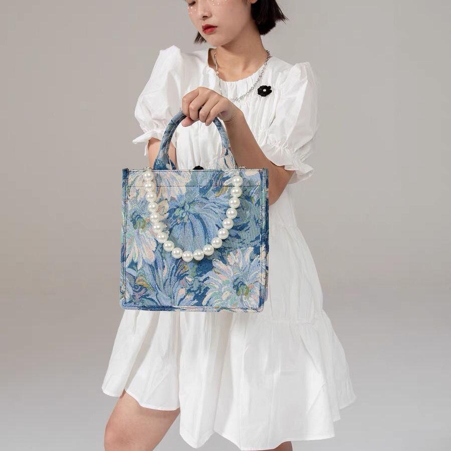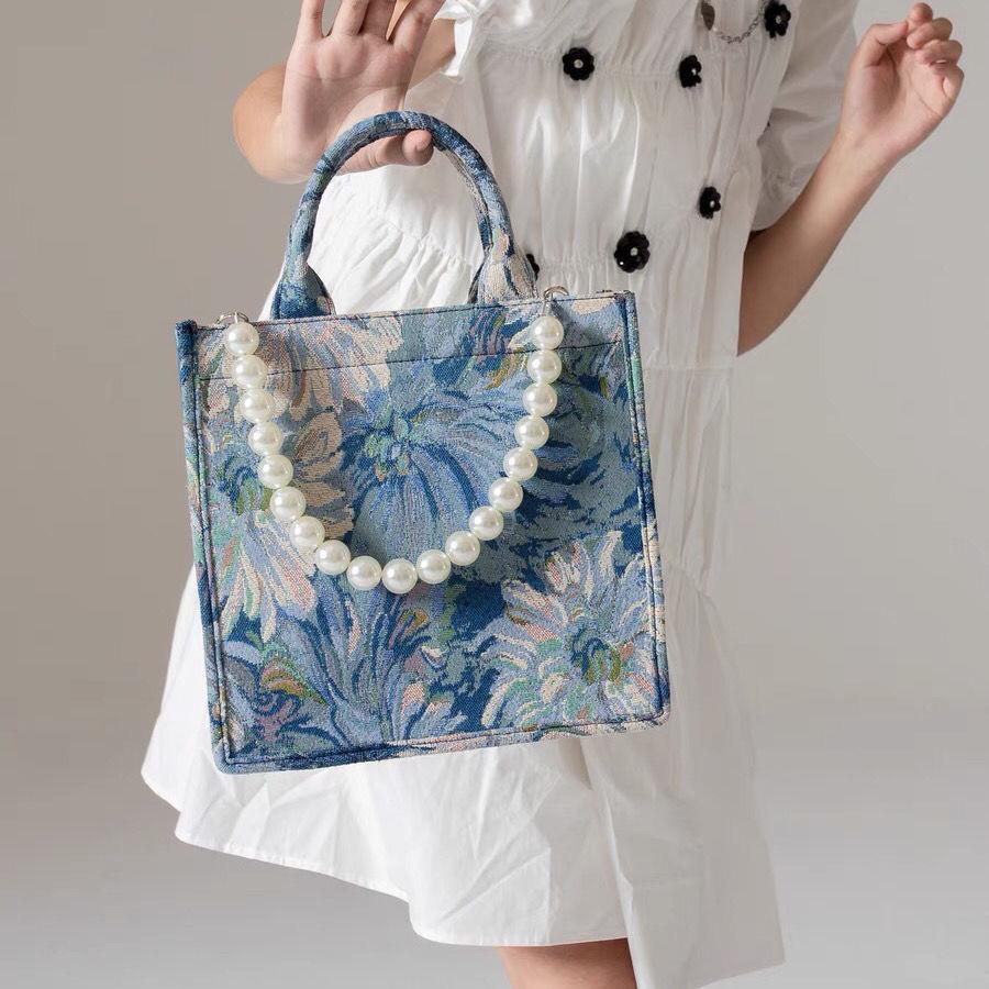 Дизайнерская женская сумка с жемчужным ремешком, модная холщовая сумка-тоут, летняя женская дорожная сумка на плечо с принтом в виде буквы, женская сумка для покупок, синяя