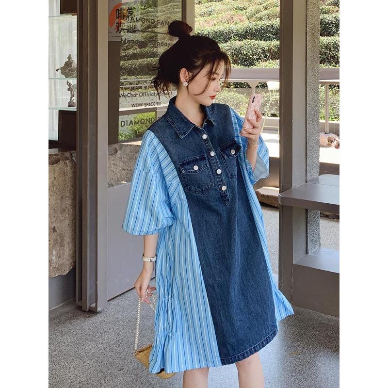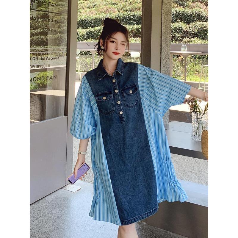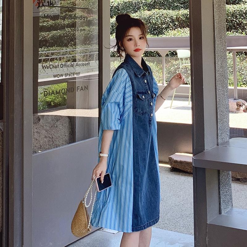 Платье из денима в полоску с воротником поло, летняя тонкая новая поддельная юбка из двух частей
