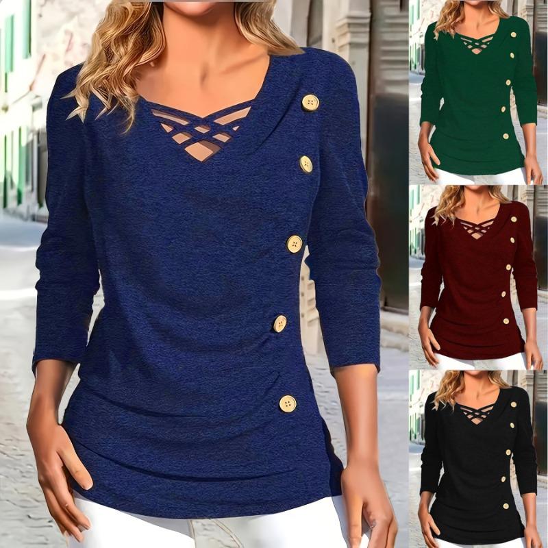 Весенние топы больших размеров, модные, элегантные, однотонные, трикотажные, с V-образным вырезом, длинным рукавом, имитацией пуговиц, большие футболки для женщин