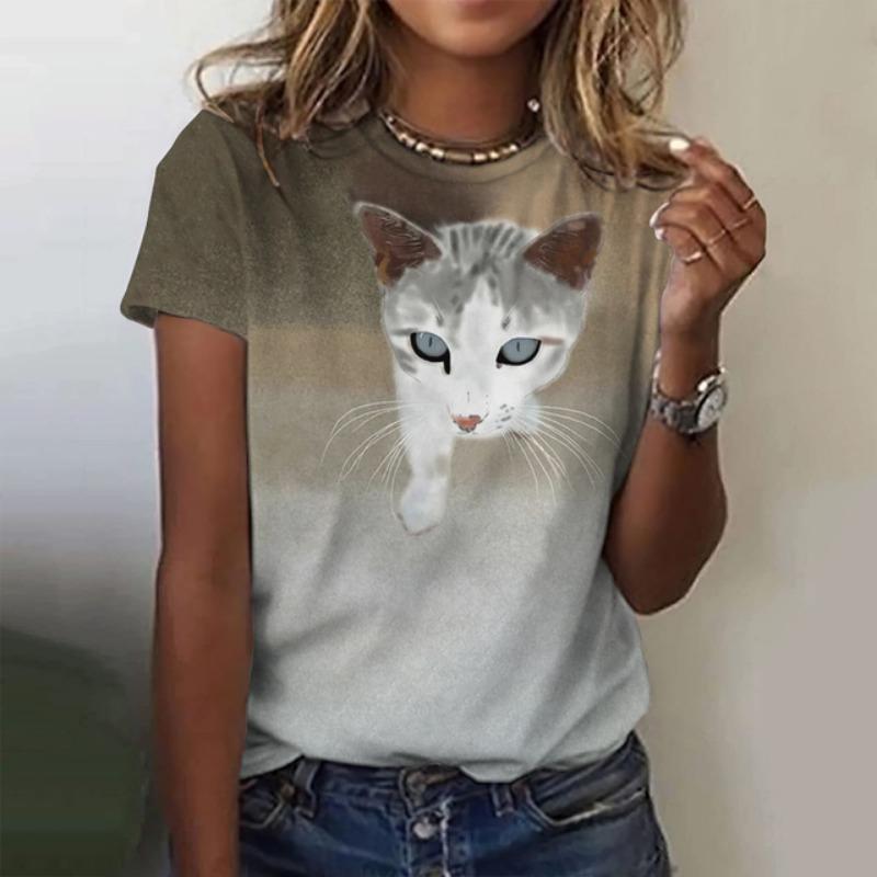 Милая футболка с изображением мультяшного кота в виде животного, женская футболка с 3D-принтом в стиле Харадзюку, повседневная женская футболка с коротким рукавом, ретро-топ с круглым вырезом, футболка