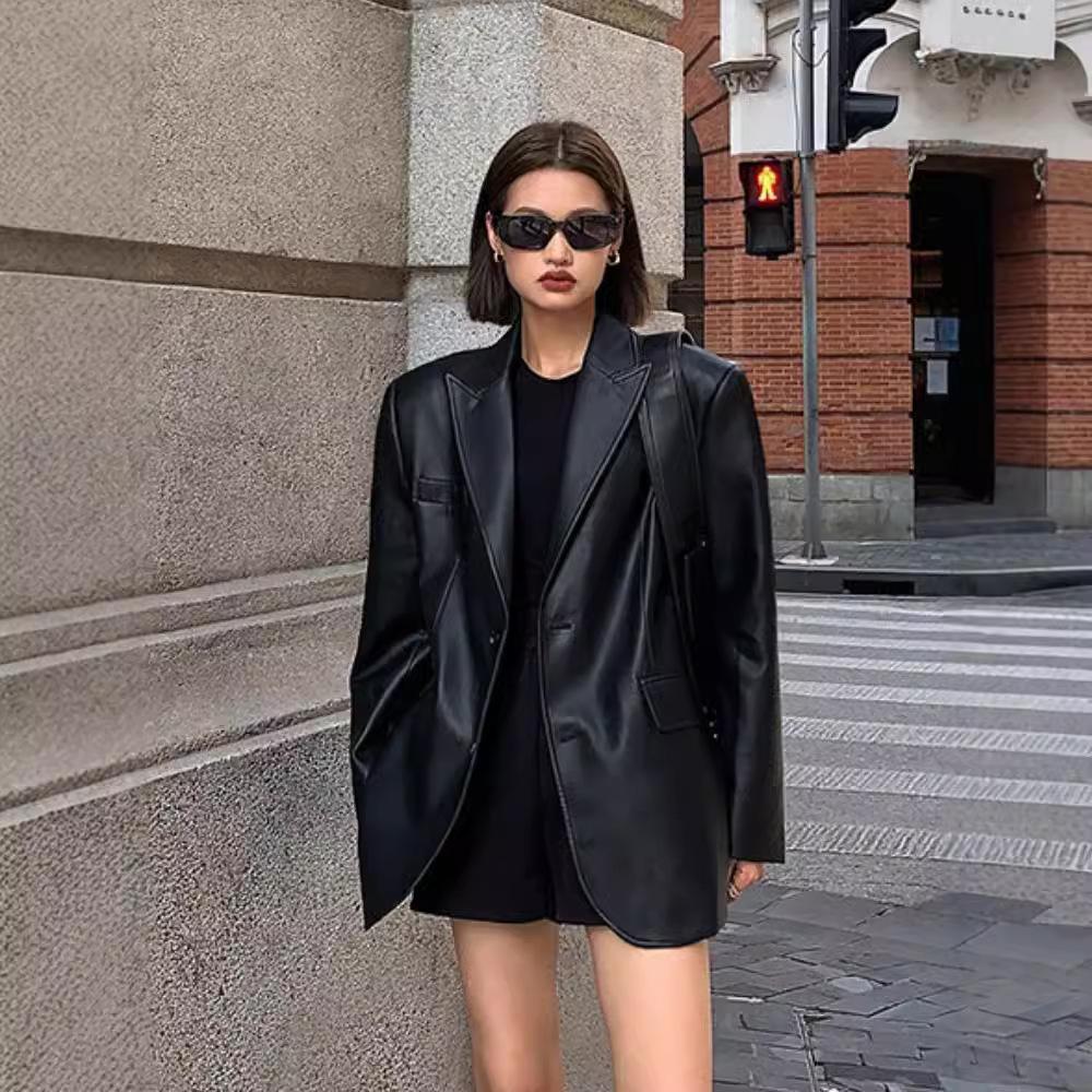 Женский черный коричневый мягкий ПУ блейзер с подплечниками, длинный рукав, однобортный свободный повседневный пиджак, топы, корейское модное пальто — купить товар онлайн с бесплатной доставкой по всему миру!