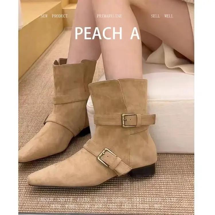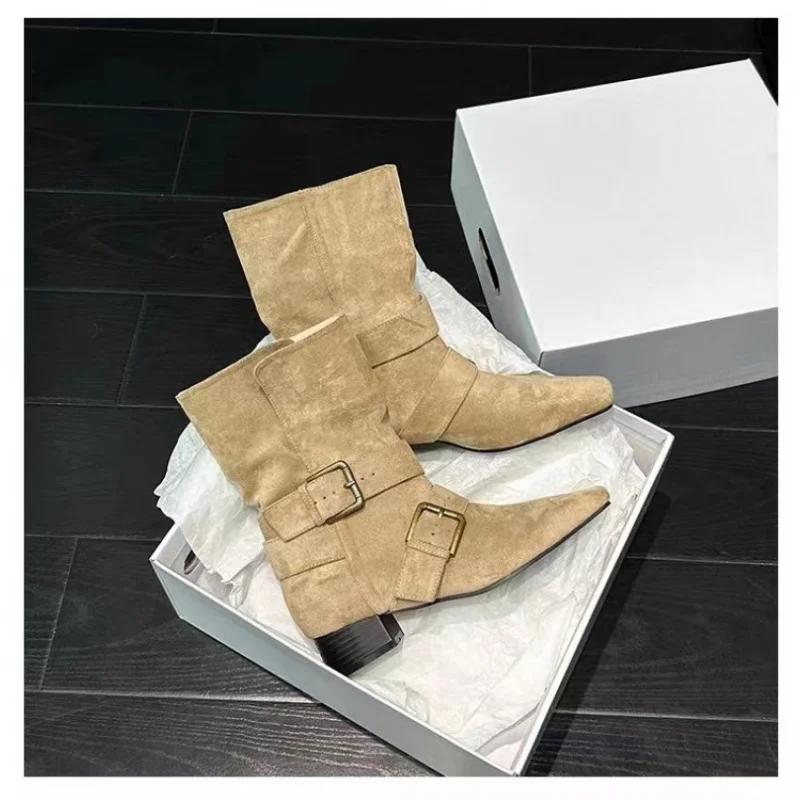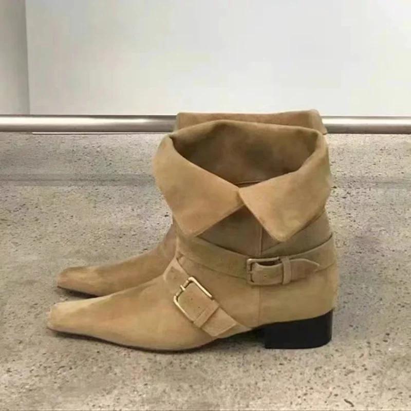 Новый модный дизайн хаки замша кожа пряжка ремешок острый носок сапоги босс панк стиль готика квадратный каблук женская обувь