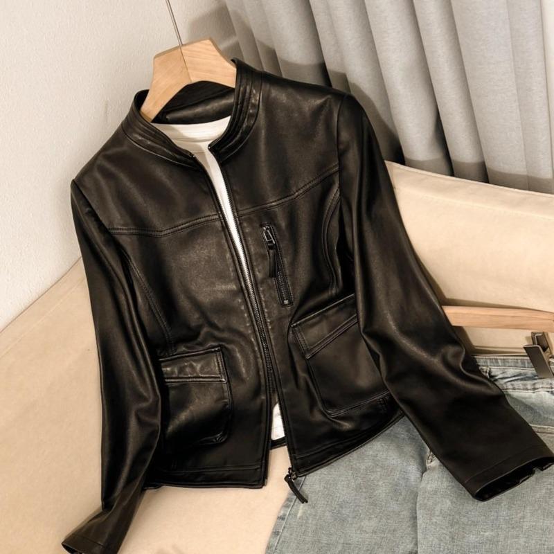 Куртка из натуральной кожи, овчина, осень, новый маленький воротник-стойка, модная тонкая короткая мотоциклетная куртка