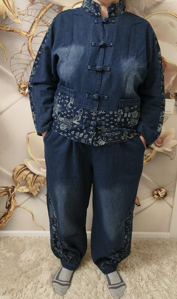 Начиталась отзывов и на свои Ог 108 От 90 Об 115 Заказала 2 xl, можно было смело на размер меньше брать Мне оказался велик И так размеры Ог 56 От 53 Об 63 Длина куртки 63 Длина штанов 94 Ткань плотная джинса, принт на спине и на карманах, на штанах вставки застежки петельки и узелки. Рекомендую данный костюм на весну, осень и теплую зиму