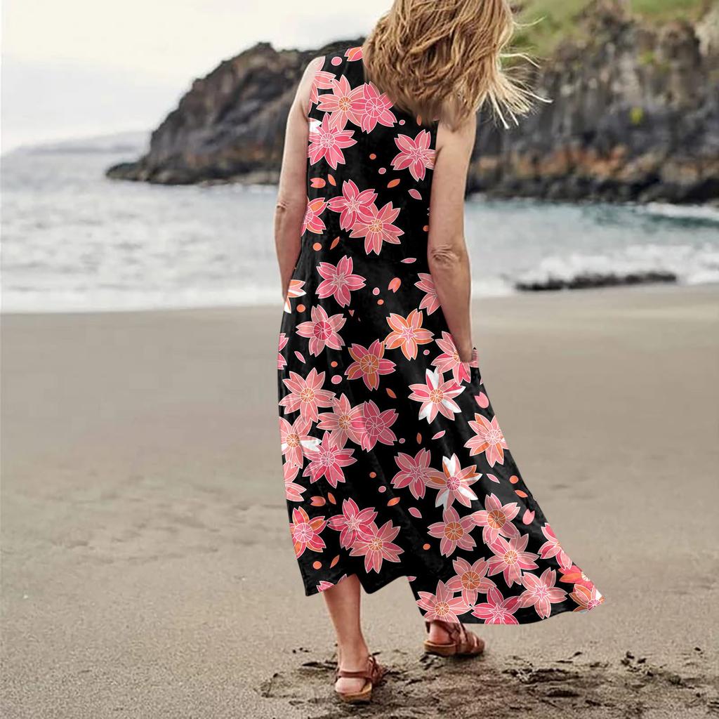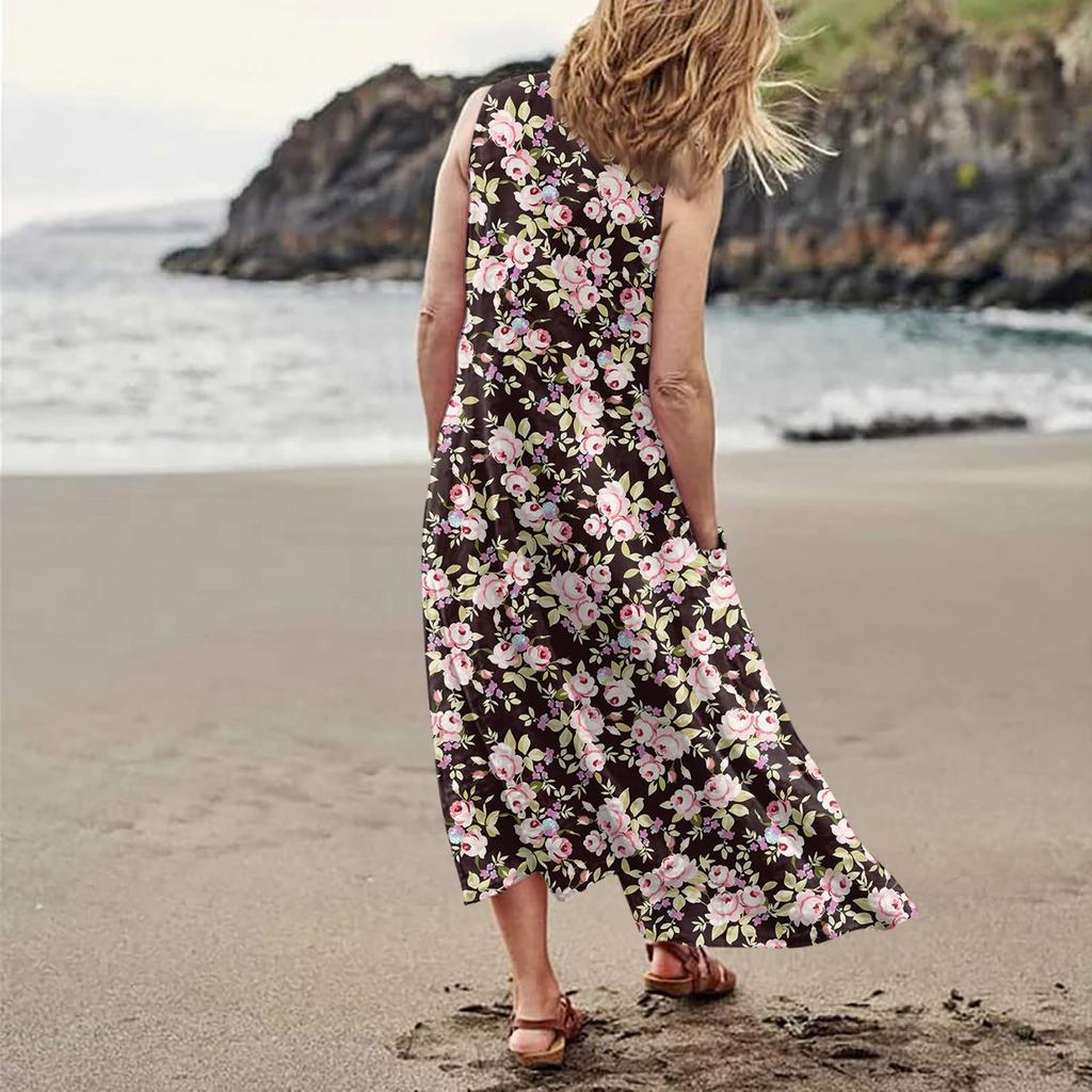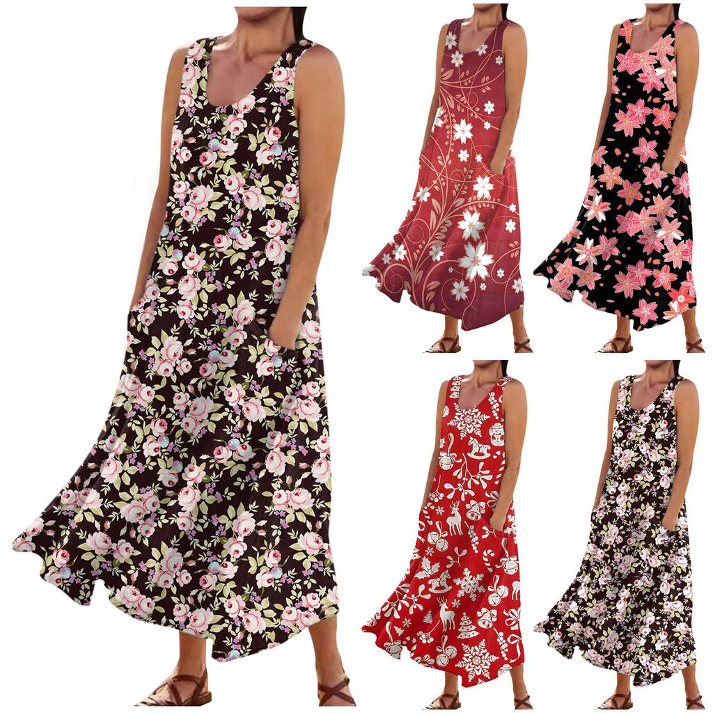 Женское повседневное удобное хлопковое карманное платье без рукавов с цветочным принтом