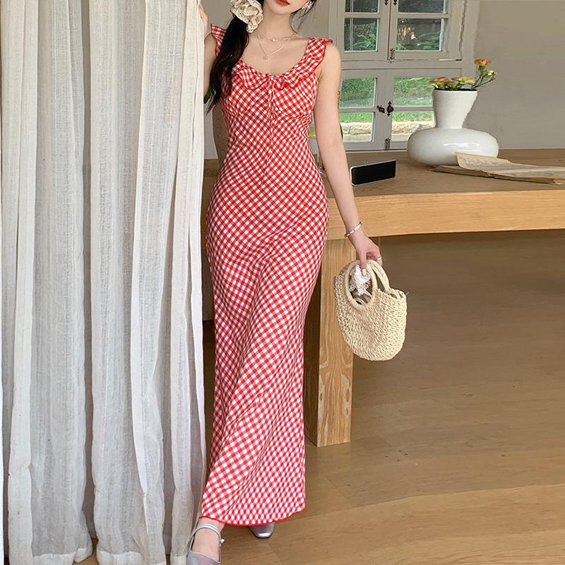 Женское летнее винтажное платье с длинными рукавами в клетку и французским воротником-халтером для отдыха на море