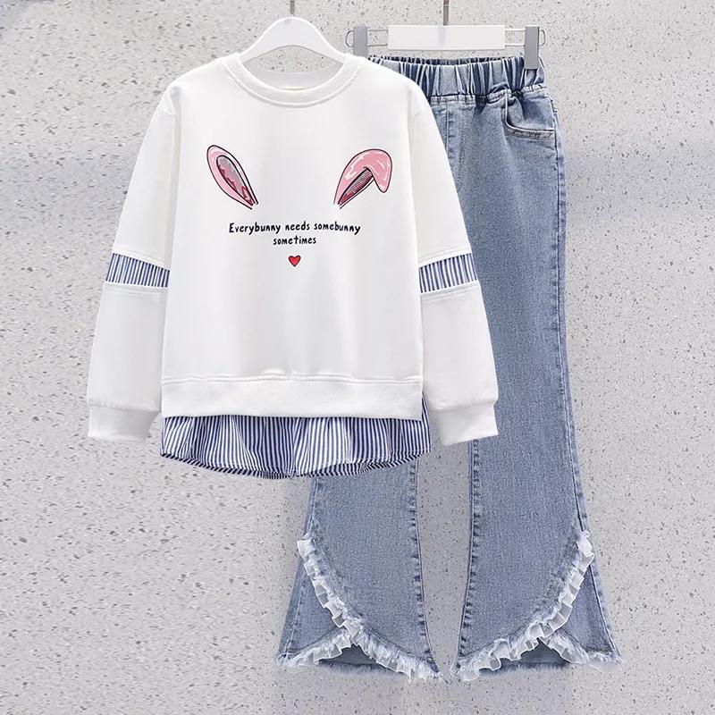 Весенний повседневный костюм для девочек среднего и старшего возраста, пуловер с длинными рукавами и круглым вырезом + джинсы, комплект из двух предметов
