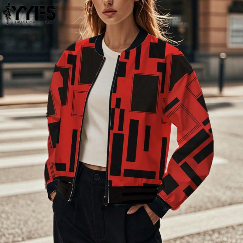 YYFS Женская мода повседневная с принтом цветных блоков осень-зима с длинным рукавом и круглым вырезом куртки и пальто