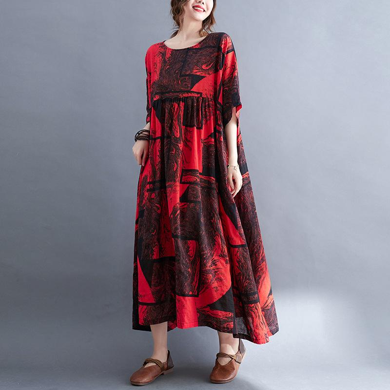 Женское платье, летнее пляжное платье больших размеров, льняное богемное платье с цветочным принтом, модное красное свободное повседневное длинное платье большого размера