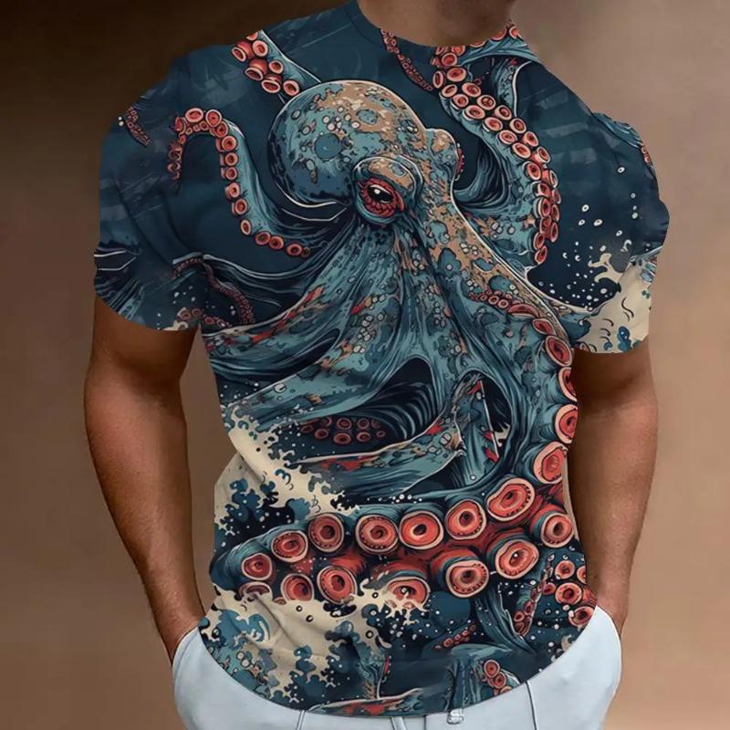 Мужская новая летняя футболка с коротким рукавом и 3d-принтом Hd с круглым вырезом и принтом «Океан», осьминог, индивидуальный ретро, свободный топ больших размеров