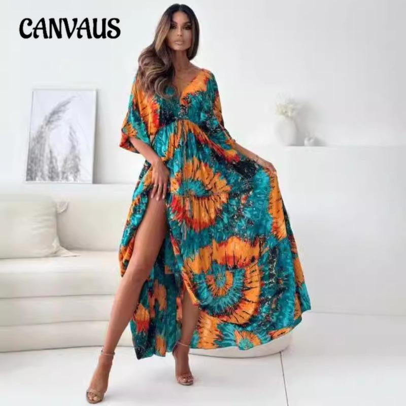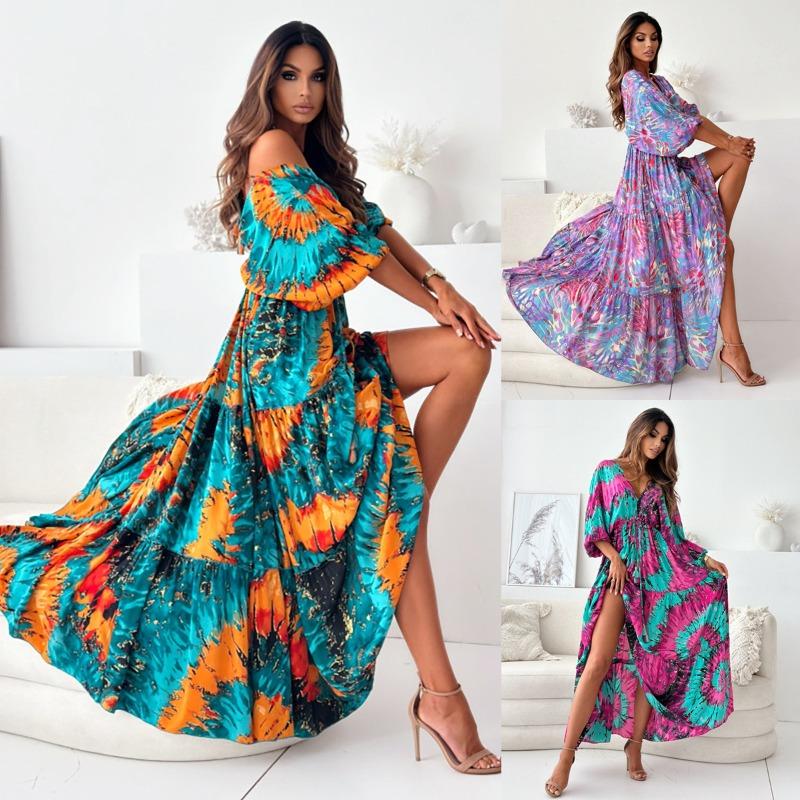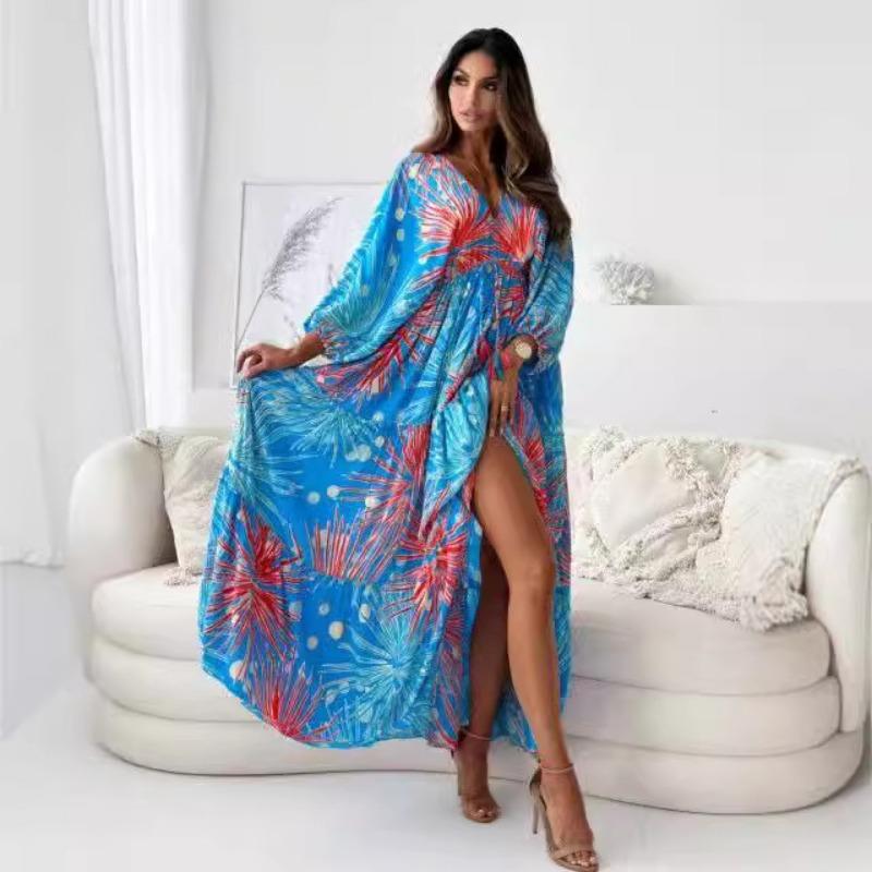 Плюс Размер Женщин Новый Seven Point Рукав Сексуальный Глубокий V Принт Разделение Платье