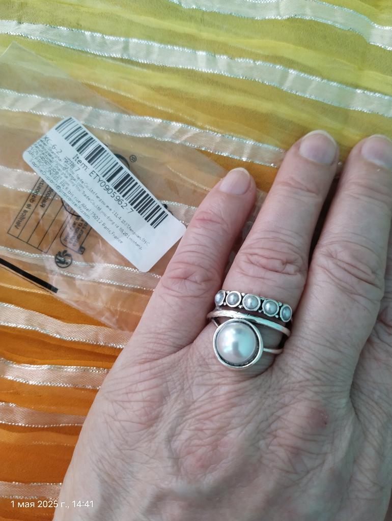 Колечко красивое, сидит удобно. Но... На фото показано как чернëное серебро. В реале на светлое серебро похоже. И камень не жемчужный с неровными краями, а круглая бусина. В целом норм. Пройдусь ещё бесцветным лаком, чтобы не облазило.