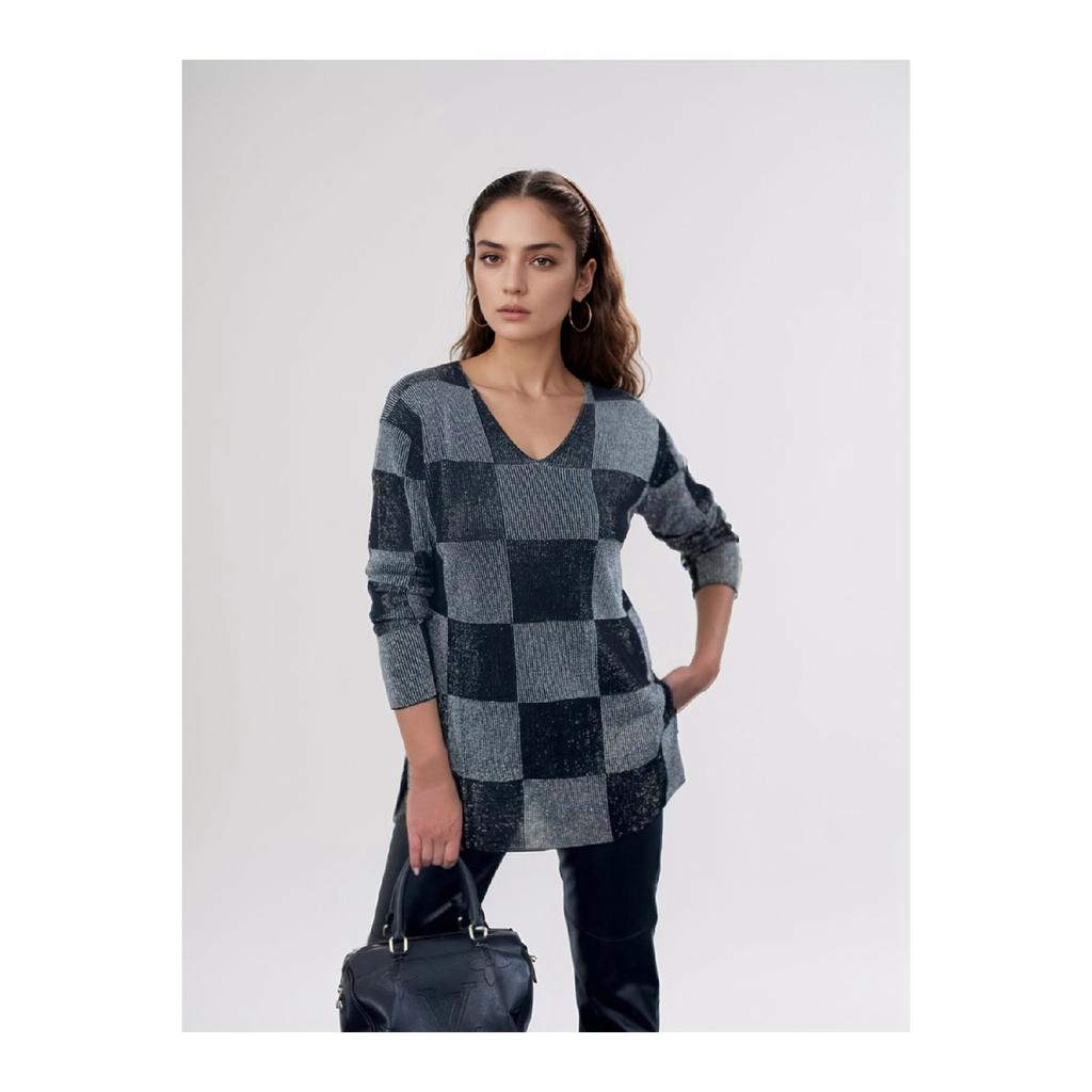 Женский блестящий свитер с квадратным узором серо-черного цвета с V-образным вырезом