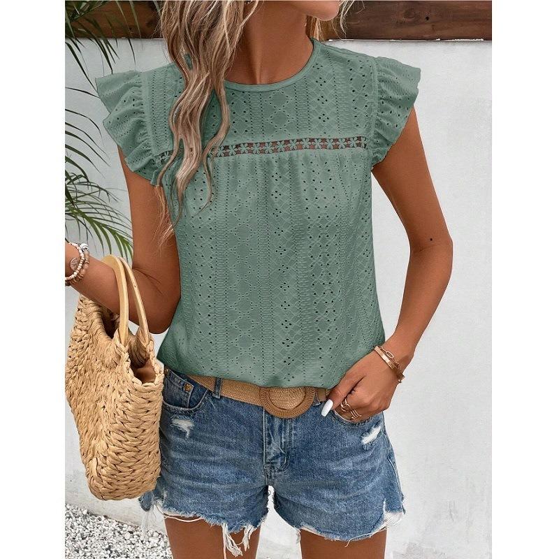 Женский летний топ с круглым вырезом и кружевом, однотонный, с короткими рукавами, с изображением листьев лотоса для женщин