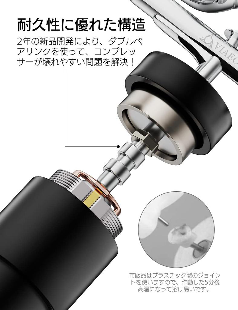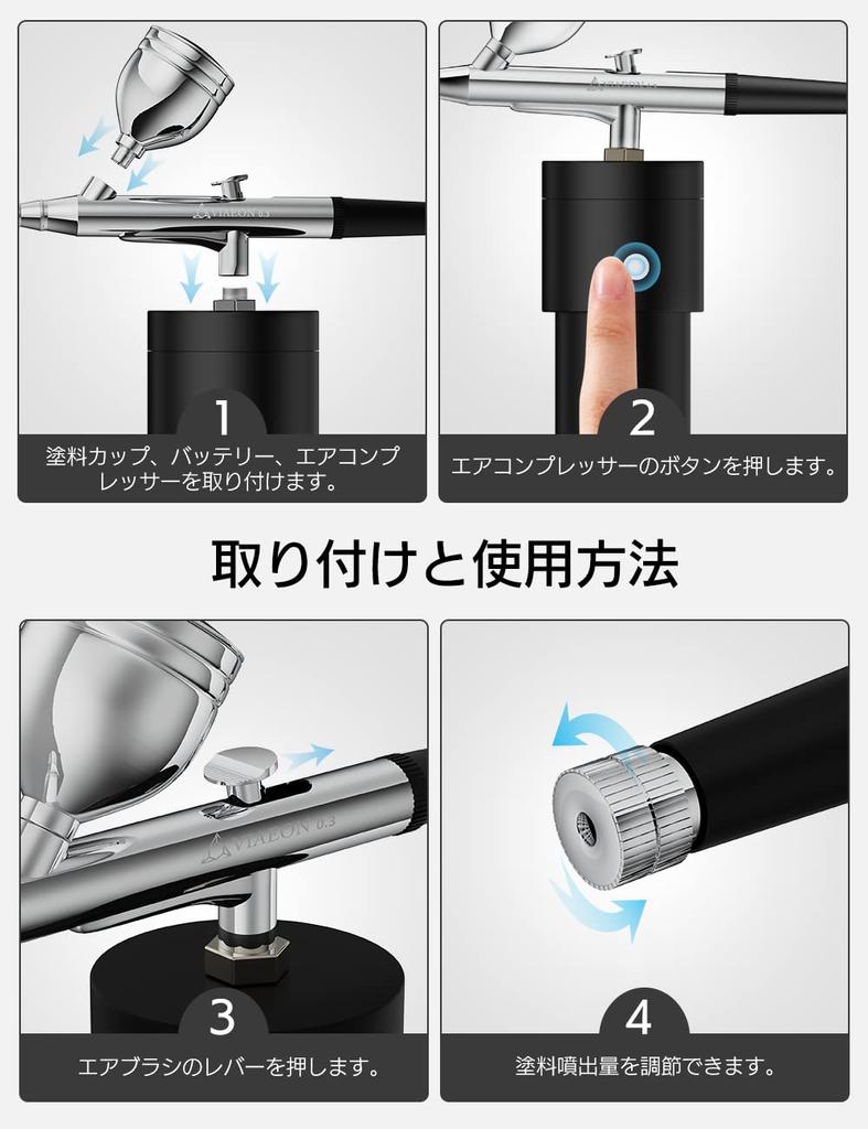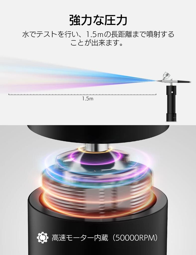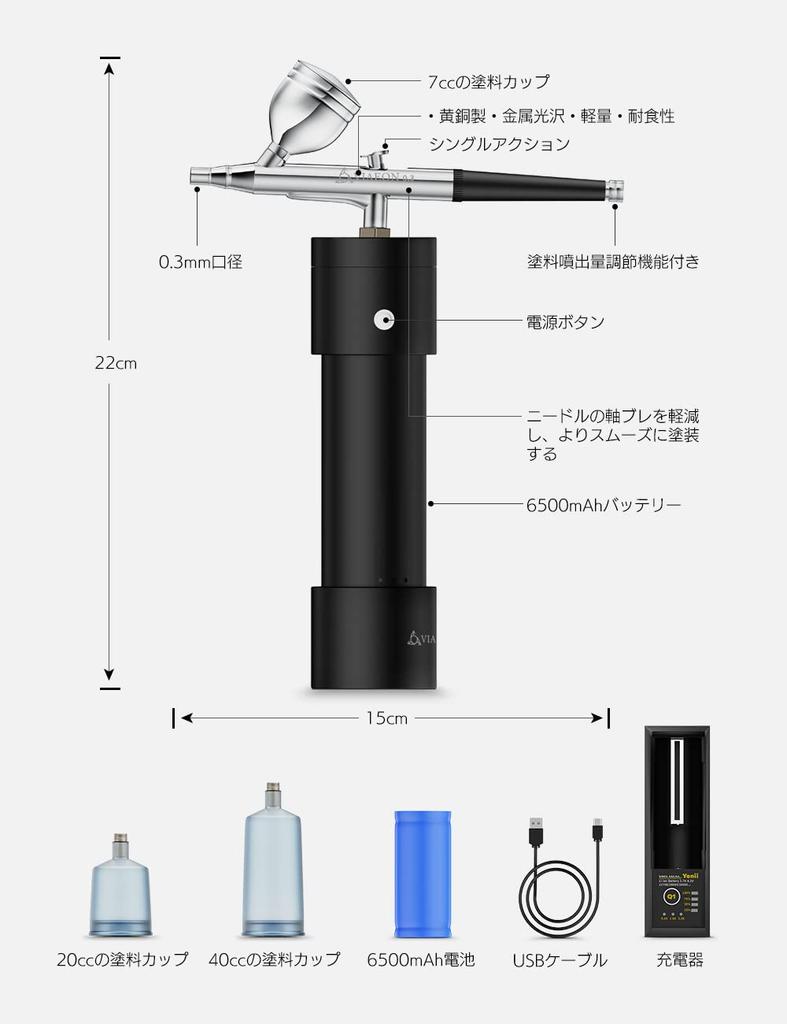 [Достаточный выход воздуха и установленное содержимое] В насосной части используется высокочастотный двигатель. Количество выбрасываемого воздуха достаточно. При испытании с водой дальность стрельбы достигает примерно 1,5 м, поэтому не стоит беспокоиться о недостаточном выходе воздуха.. Сам наконечник изготовлен из латуни, которая устойчива к коррозии и имеет хорошую прочность.. Емкость съемного металлического бачка для краски составляет 7 куб. см.. В комплект также входят бачки для краски объемом 20 и 40 куб. см.. При покраске больших площадей можно заменить большой бачок для краски.. В комплект также входит руководство по эксплуатации, зарядное устройство, USB-кабель и батареи.. Упаковка и отделка корпуса превосходны.