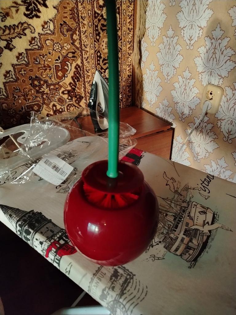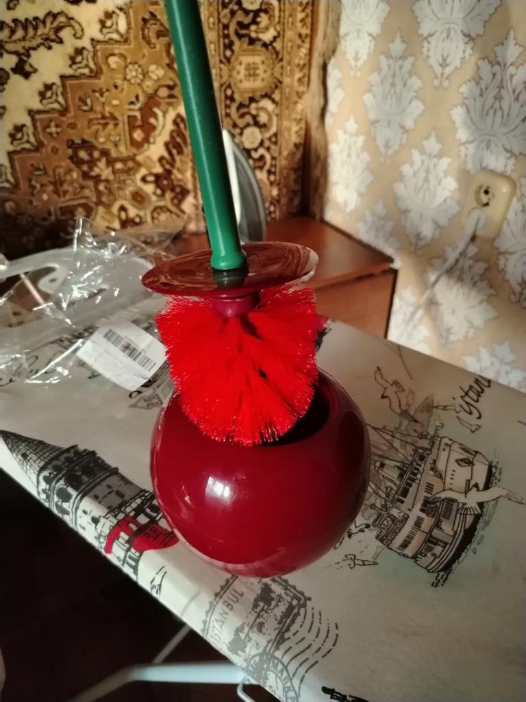 Сама идея ершика и ведёрка в виде вишни хорошая, но пластик красится, пока рассматривала, ладошки окрасились. Емкость под ёршик пришла поврежденной, с вмятиной на боку и трещина по резьбе. Жаль, буду оформлять спор