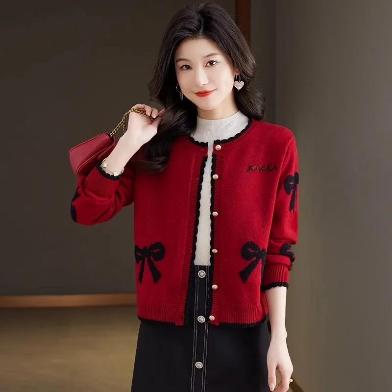 Весна Осень Красное Вязаное Пальто Женский Кардиган Короткий Маленький Шаль Свободный Круглый Вырез Вязаный Кардиган Свитер Женское Пальто