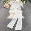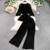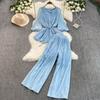 Весна-лето Женский плиссированный комплект из двух предметов Элегантная шифоновая блузка с V-образным вырезом и драпировкой + широкие брюки с высокой талией Костюм из 2 предметов для женщин Новый