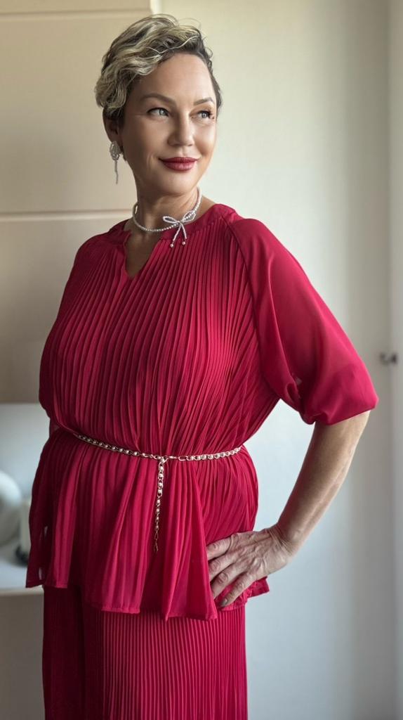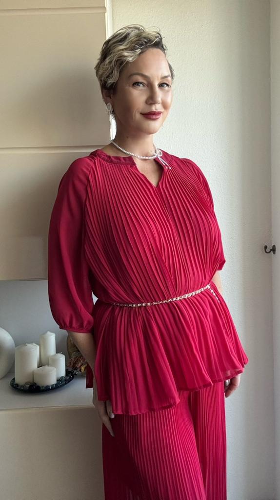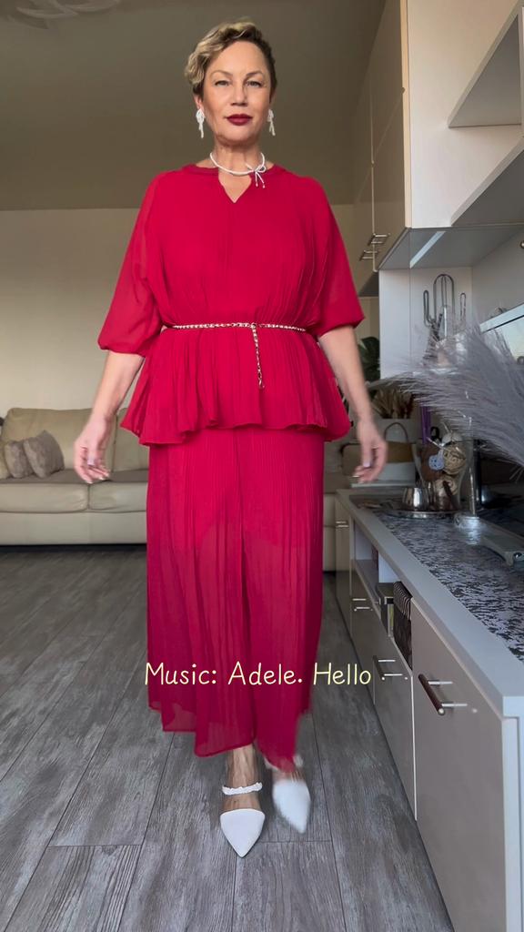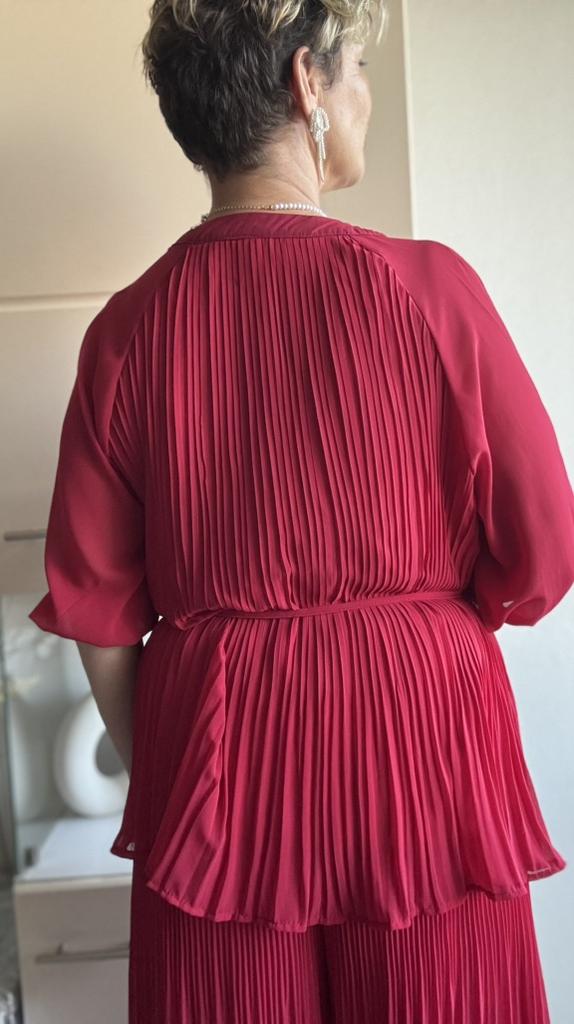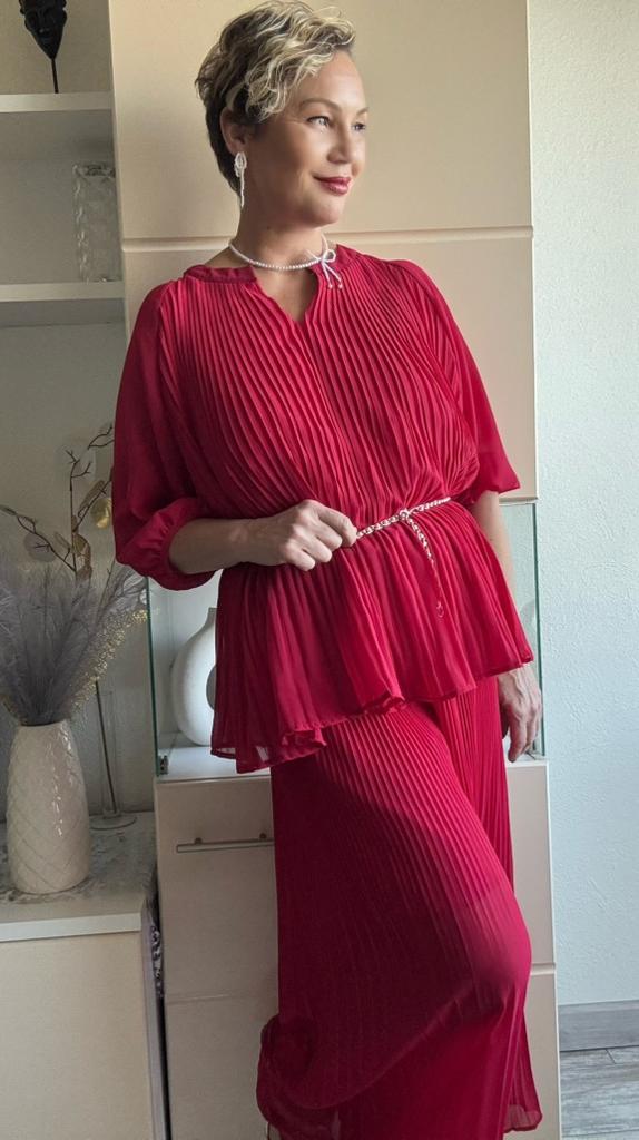 Брючный костюм из гофрированной ткани ✔️Пять цветов на выбор Размер единый Мои параметры: 167, 98-85-100. По размеру отлично, костюм подойдет на параметры больше и меньше моих. ✔️Фасон: Блуза с V- образной горловиной Силуэт трапеция Рукав реглан, с тонким манжетом, который не тянется Подкладка пришита, она выглядит как топ Брюки с высокой посадкой На талии резинка Карманов нет С изнанки вшиты длинные шорты В комплекте тонкий тканевый пояс ✔️Ткань: Полиэстер Просвечивает Не тянется, слегка электризуется Гофре разного размера . Наверху у брюк мелкий, к низу становится шире ✔️Пошив фабричный 📐Замеры: 📌Блуза: Плечи нет Длина рукава от горловины 50 Длина рукава от подмышки 21 Ширина рукава в предплечье 23 ОГ подмышками 120 ОТ 140 ОБ 180 Длина 70 📌Брюки: ОТ 60-106 ОБ 128 Высота посадки 31 Длина внутреннего шва 59 Длина 94 Ширина брючины внизу 47( полуобхват, без растяжения)