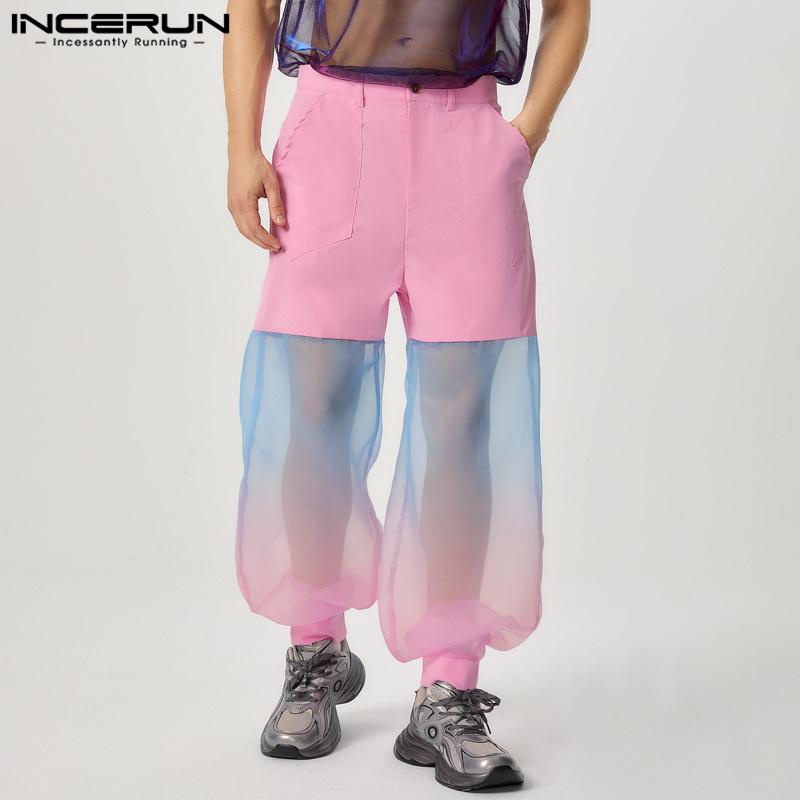 INCERUN Мужские сетчатые брюки в стиле пэчворк с градиентным узором в технике тай-дай и высокой талией, прозрачные брюки