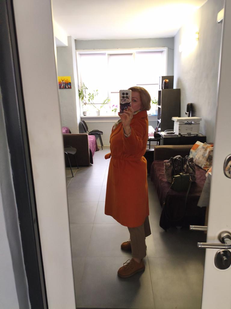 Пальто за такие деньги - чудесное. Пришло с вешалкой, аккуратно завернутое в пленку-пакет. Материал мягкий, сделан под шерсть. Цвет: спокойная сирень. Для высоких (179см) предупреждение: рукав-реглан (спущенный с плеча) коротковат, но можно подвернуть три-четверти и сделать напускной манжет, ведь пальто на слегка прохладную погоду (теплые осень/весна). Пояс находится на месте талии и длина получается ниже колена. На 44-46 размер: оверсайз. Фигура смотрится в нем стройно. Спасибо продавцу за качественный товар.
