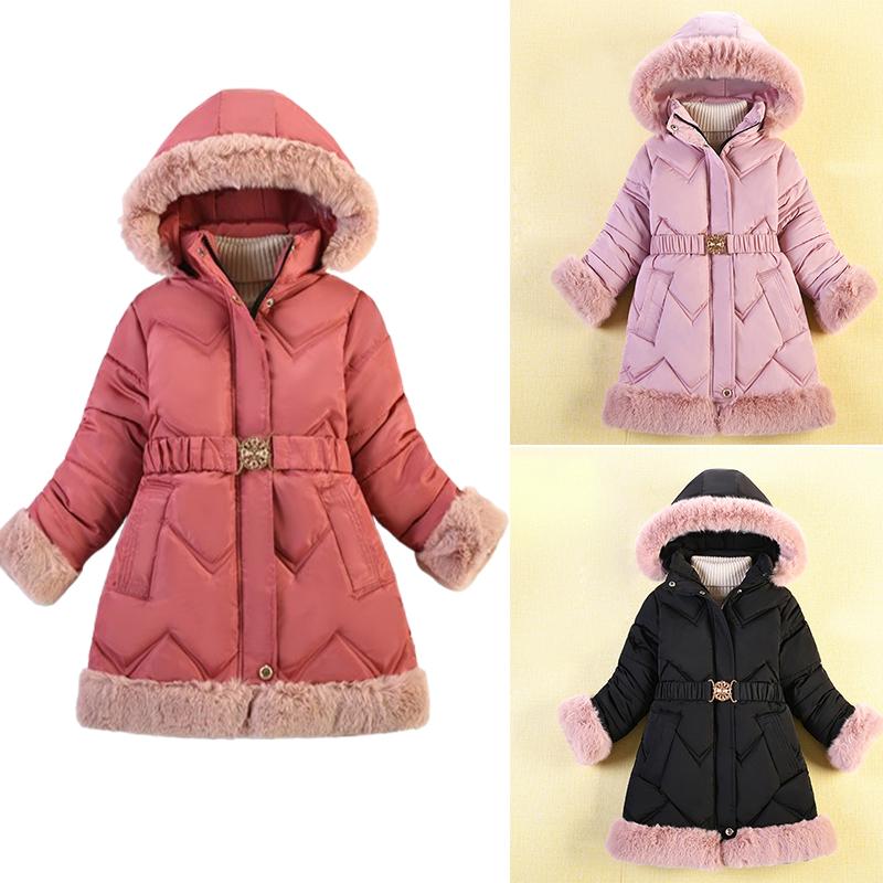 Зимние стеганые куртки для девочек, утепленное бархатное пальто с капюшоном, молнией, меховым воротником, верхняя одежда для принцесс, детские пальто