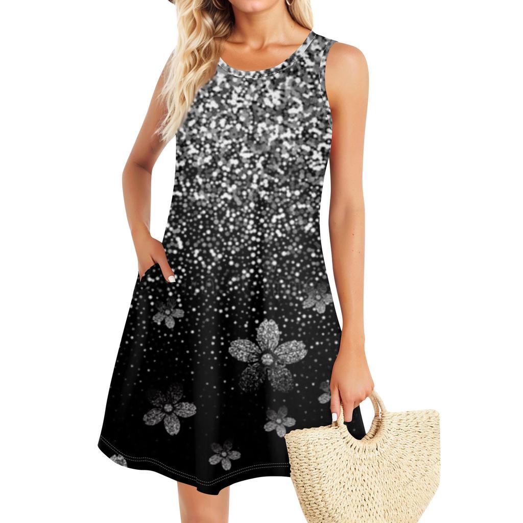Летние платья для женщин Пляжный Бохо Без рукавов Принт Струящиеся Карманы Футболки Сарафаны