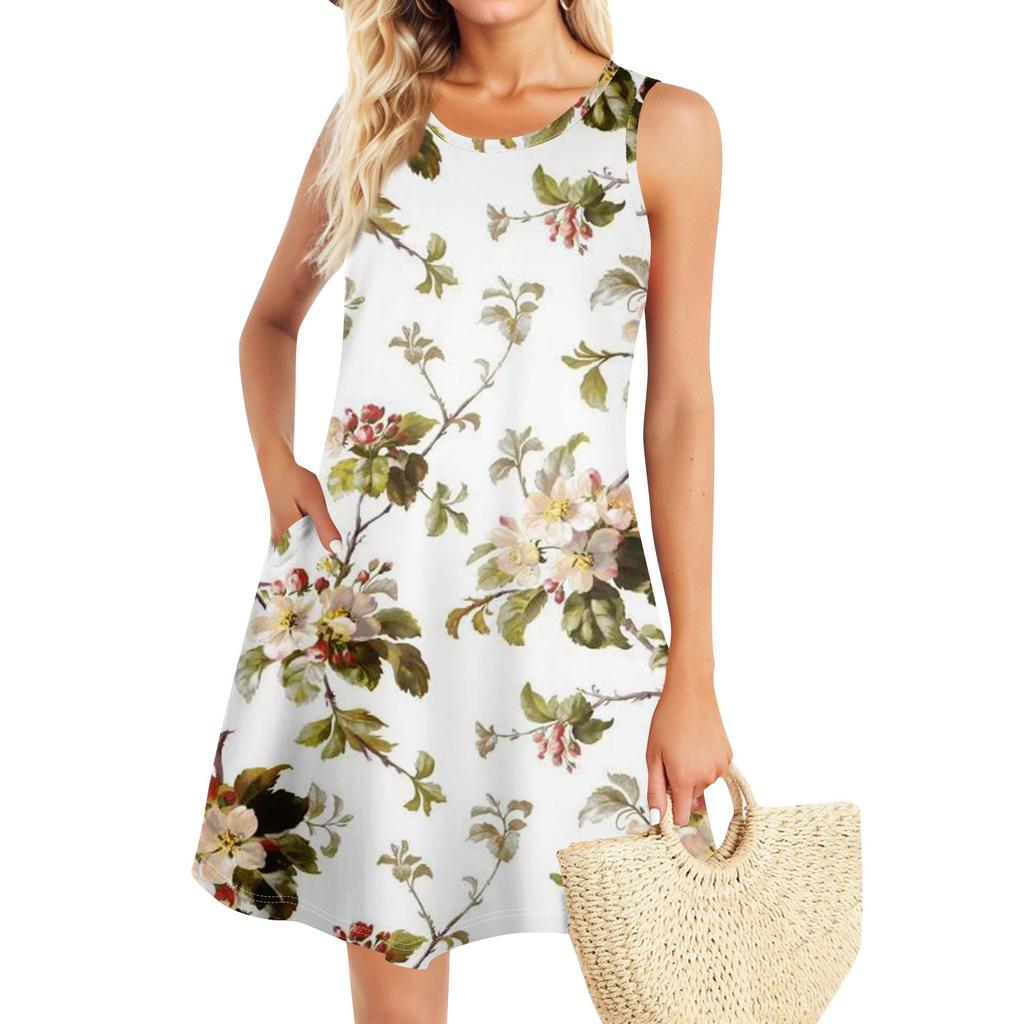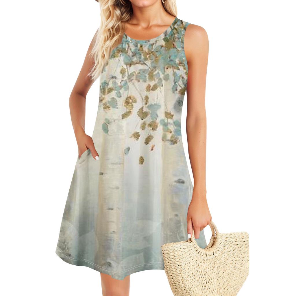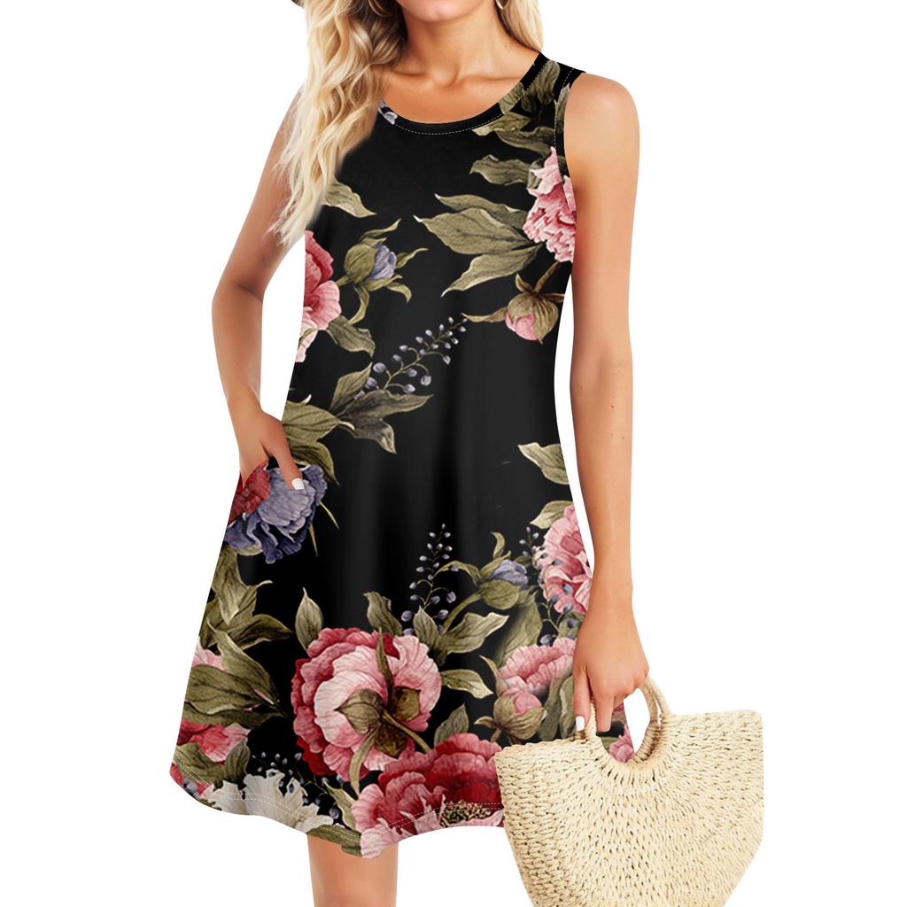 Летние платья для женщин Пляжный Бохо Без рукавов Принт Струящиеся Карманы Футболки Сарафаны