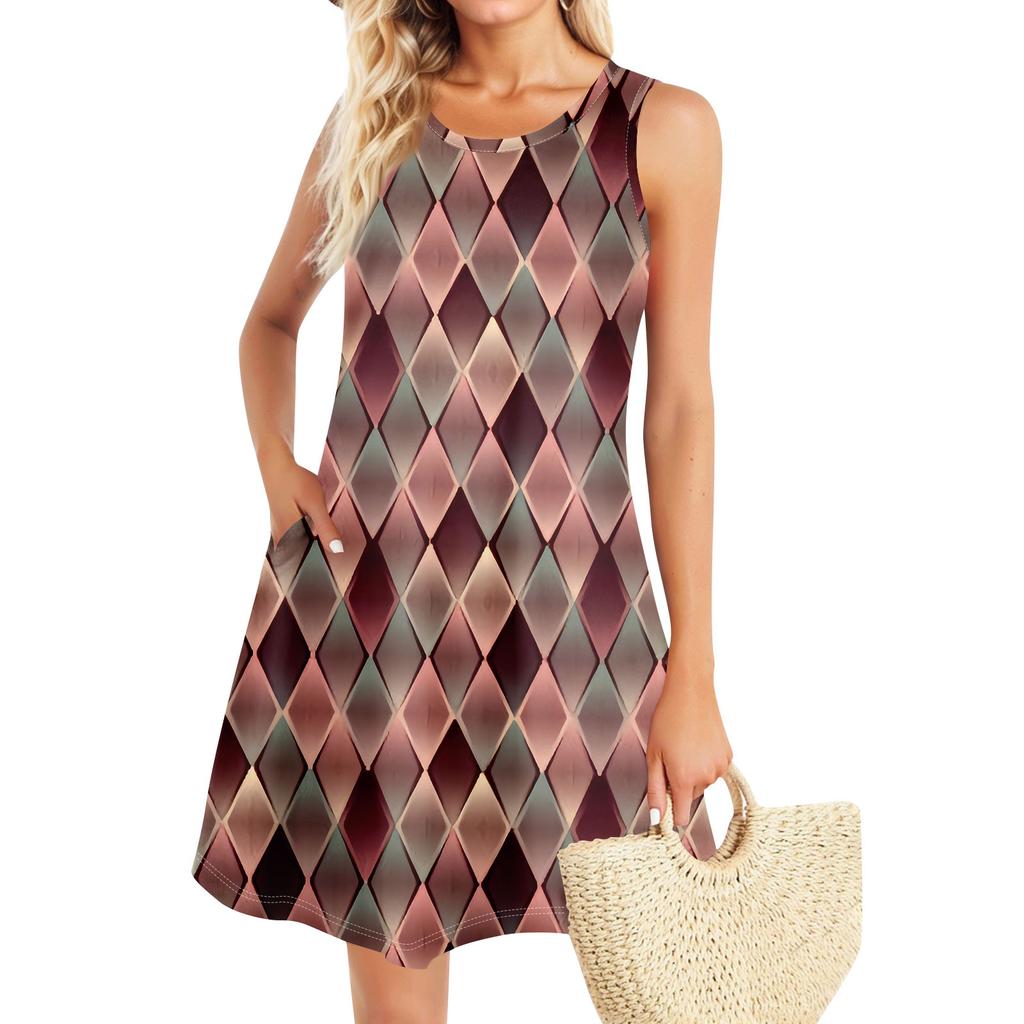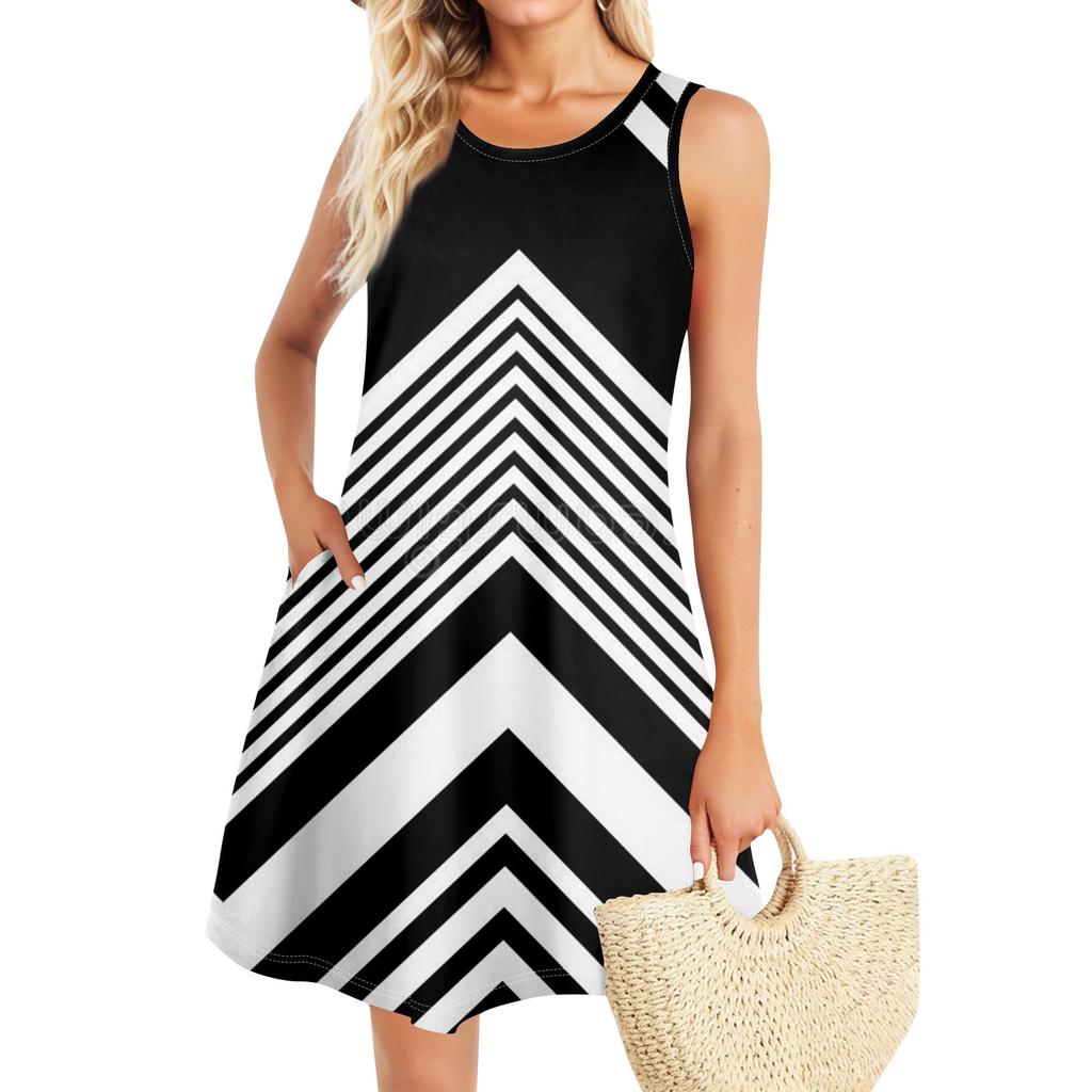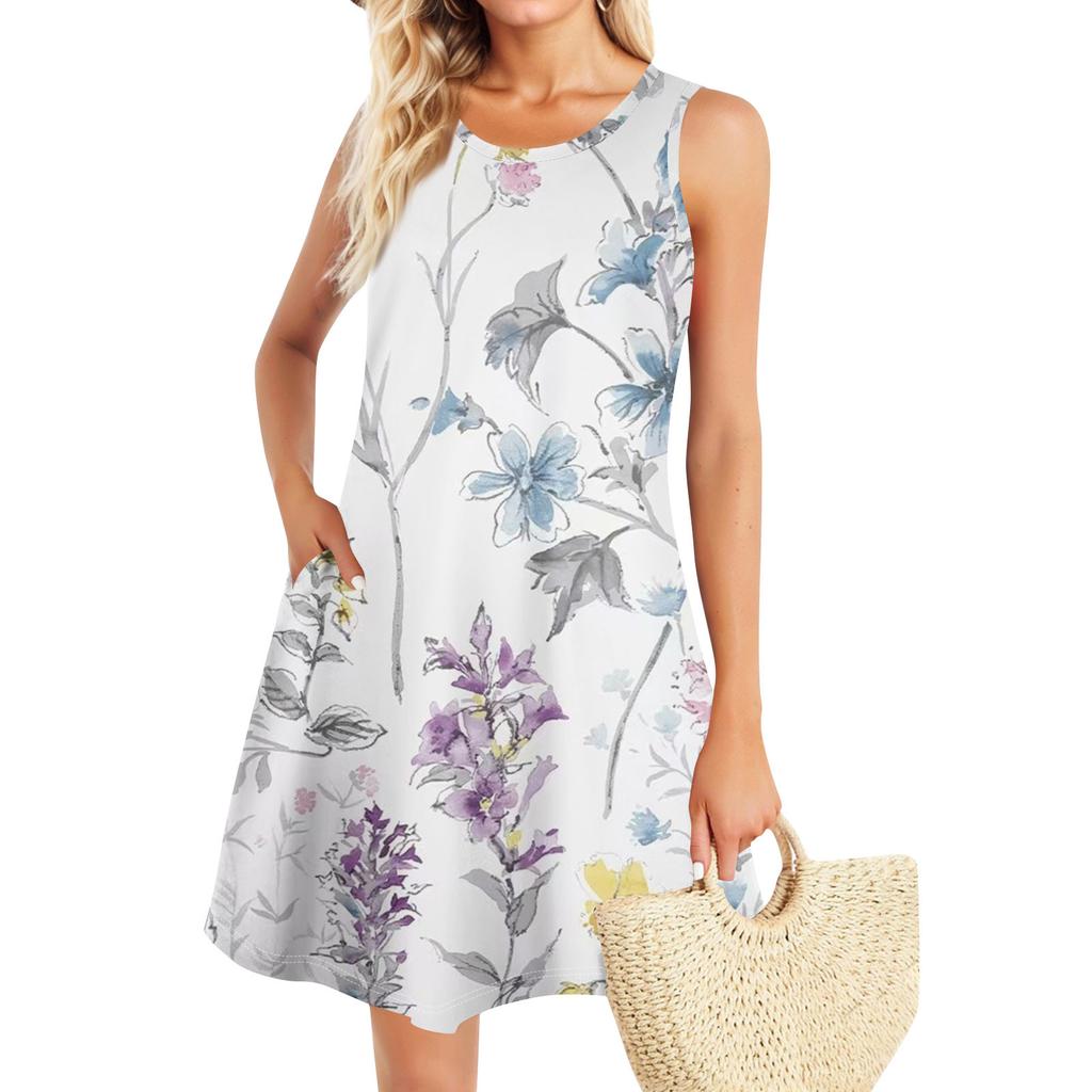 Летние платья для женщин Пляжный Бохо Без рукавов Принт Струящиеся Карманы Футболки Сарафаны