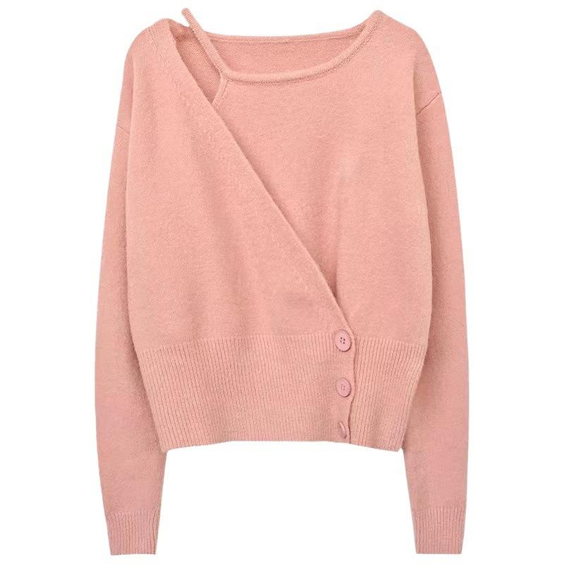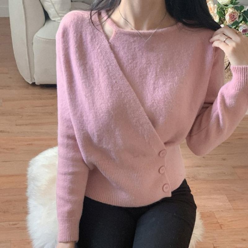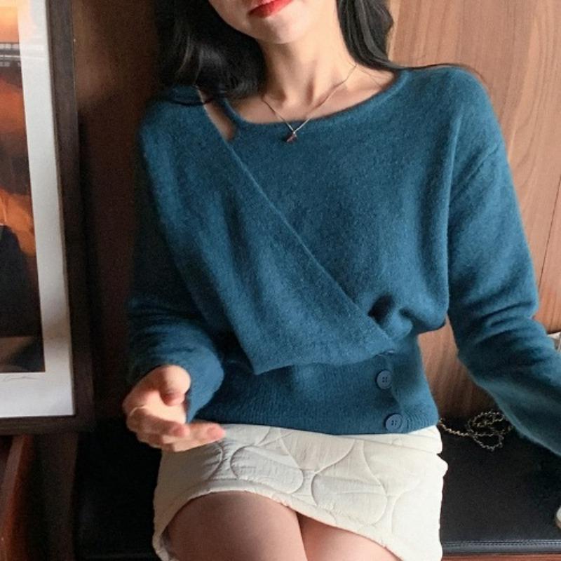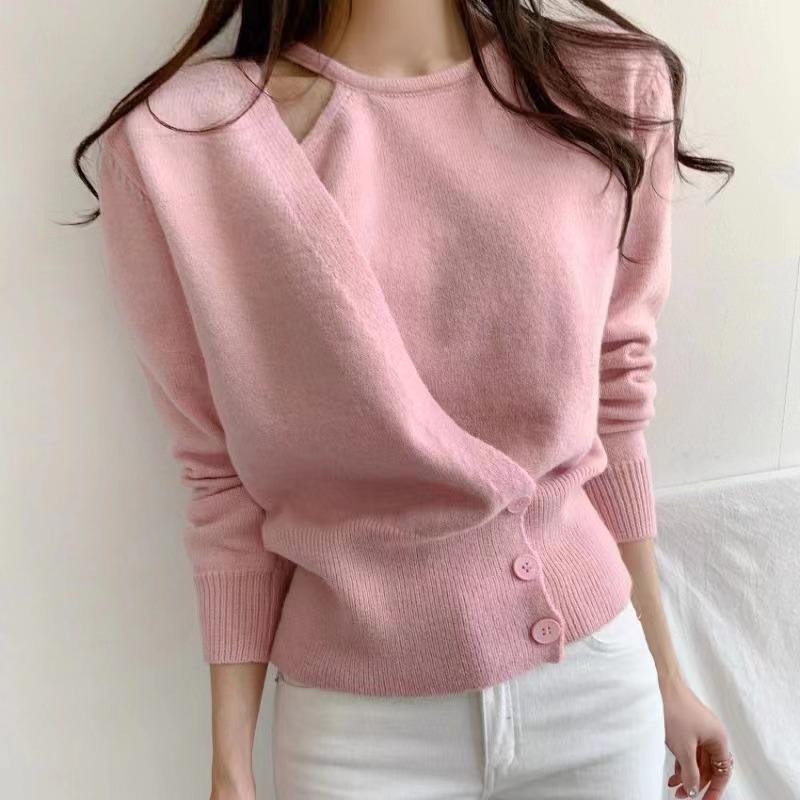 Корейский осенний дизайн Chi Sense нерегулярный поддельный двухсекционный трикотажный свитер с тремя пуговицами на талии