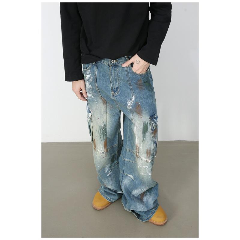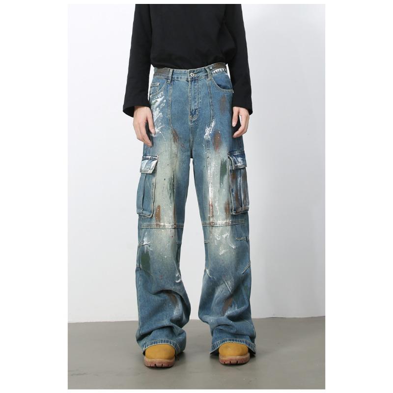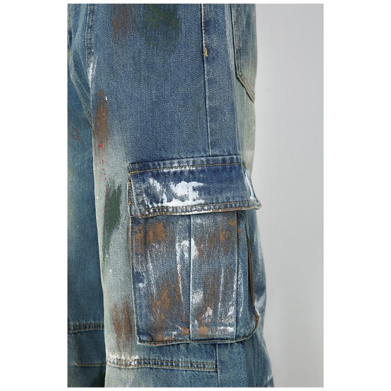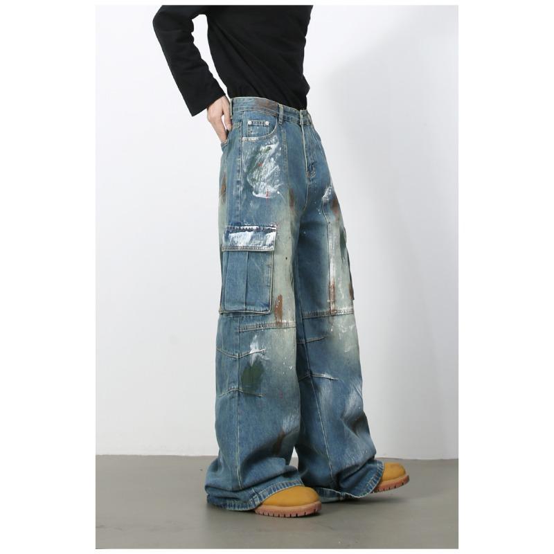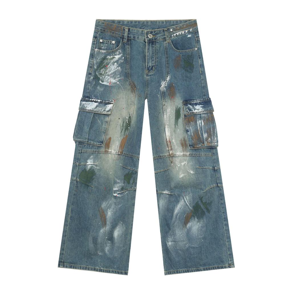 Джинсы широкие с множеством карманов и синим принтом граффити, мужские свободные прямые рабочие брюки, прямые свободные джинсы для мужчин, модные и удобные брюки