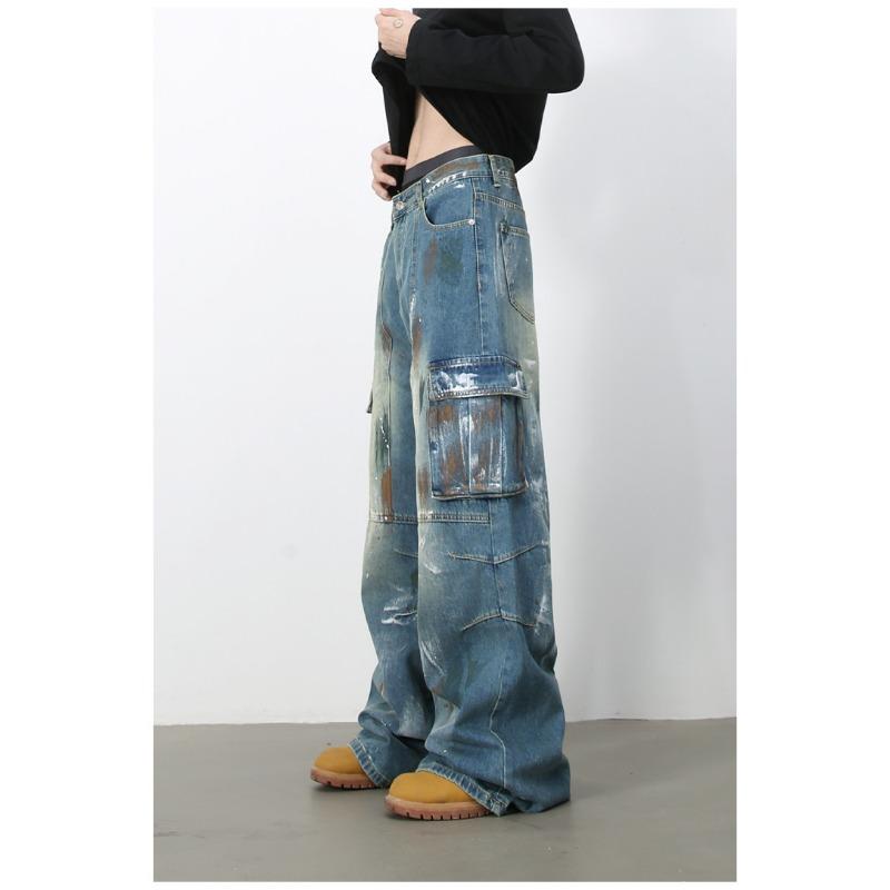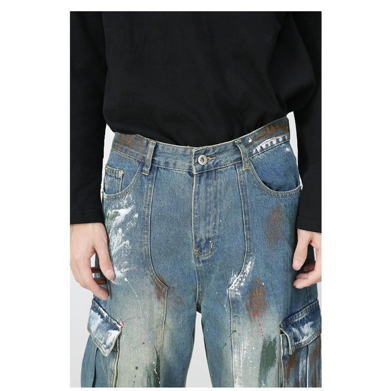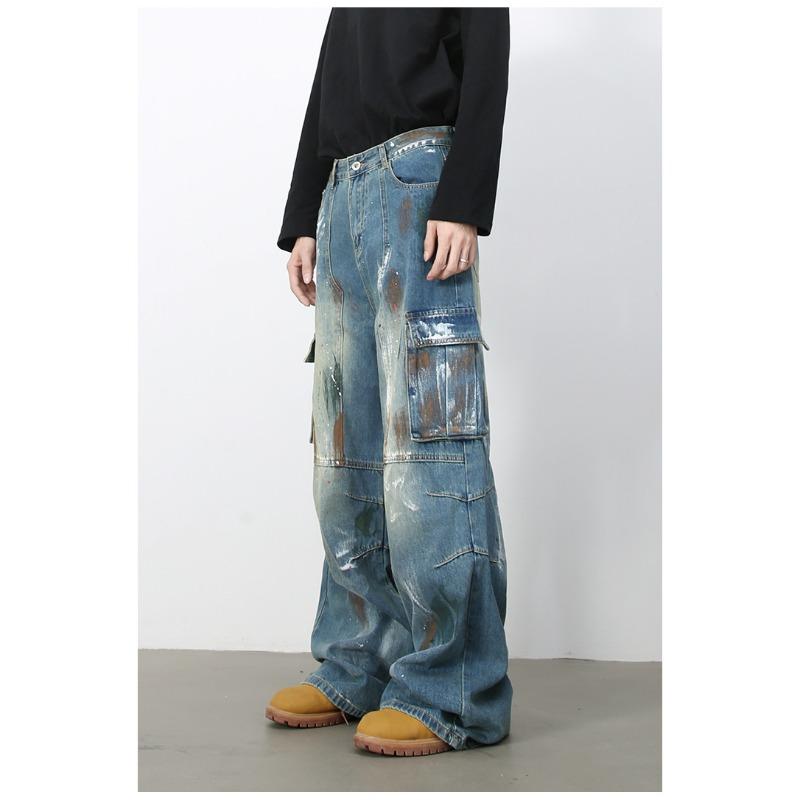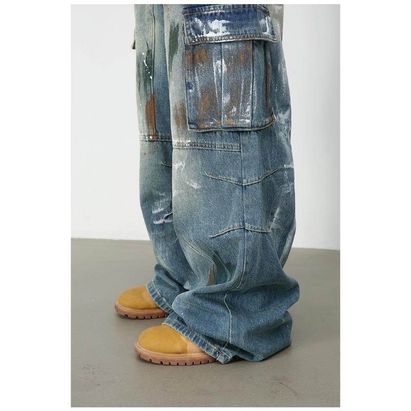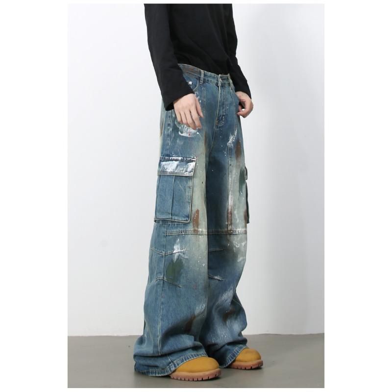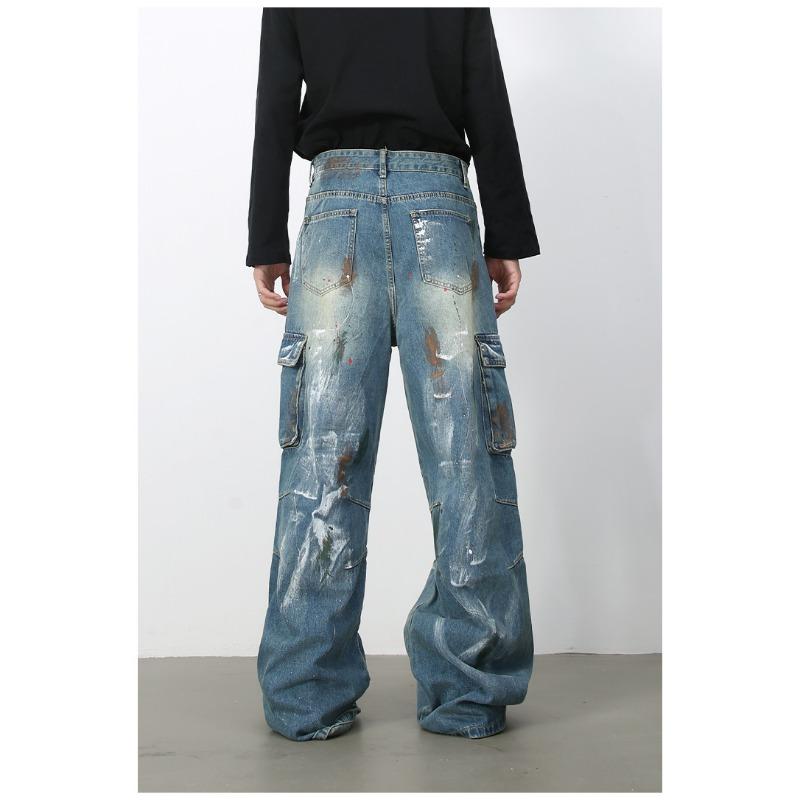Джинсы широкие с множеством карманов и синим принтом граффити, мужские свободные прямые рабочие брюки, прямые свободные джинсы для мужчин, модные и удобные брюки