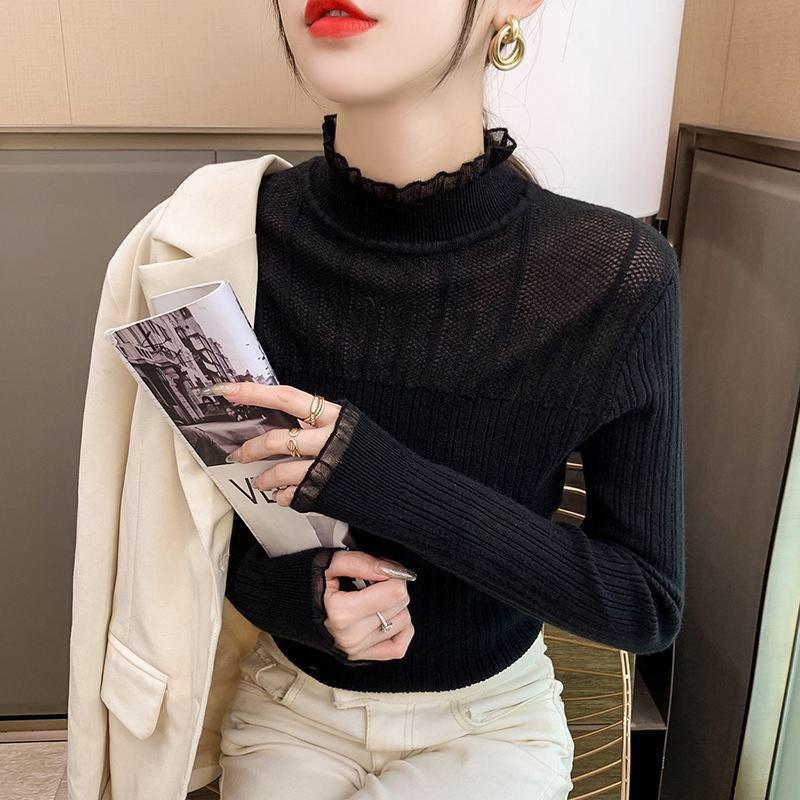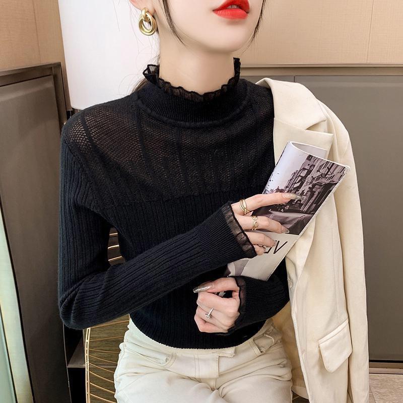 Рубашка нижнего слоя для осенне-зимней женской одежды, облегающий трикотажный свитер с высоким воротником и кружевной отделкой