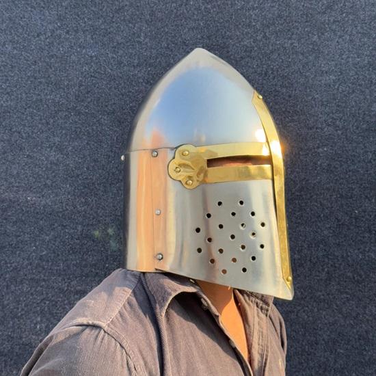 Этот шлем является точной копией большого шлема, использовавшегося во время крестовых походов.. Его цилиндрическая форма с плоским верхом и узкими прорезями для глаз воспроизводит исторический дизайн, обеспечивая аутентичный вид для реконструкций, представлений и костюмов.