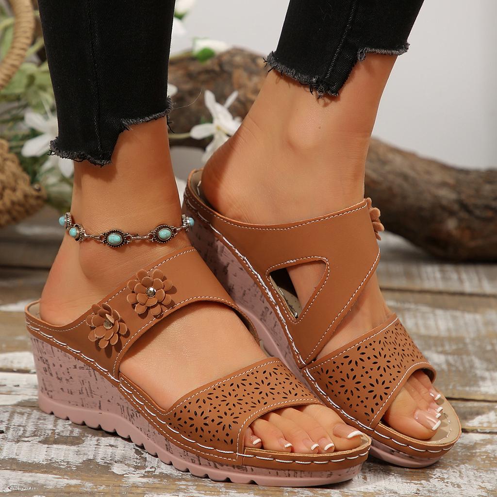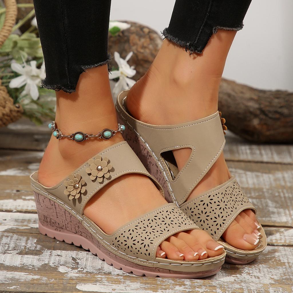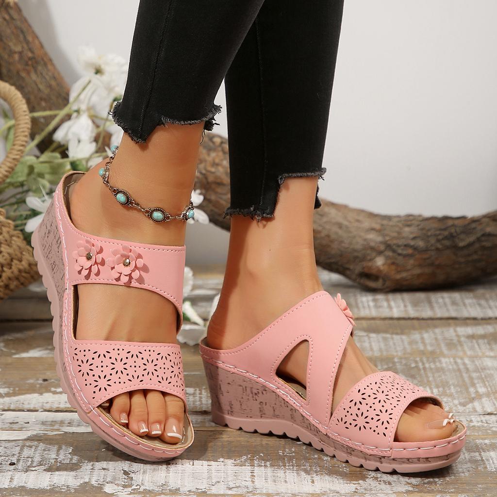 Летние новые стильные тапочки на толстом каблуке с покатым дном, женская обувь, однотонные тапочки с цветочным декором на покатом каблуке